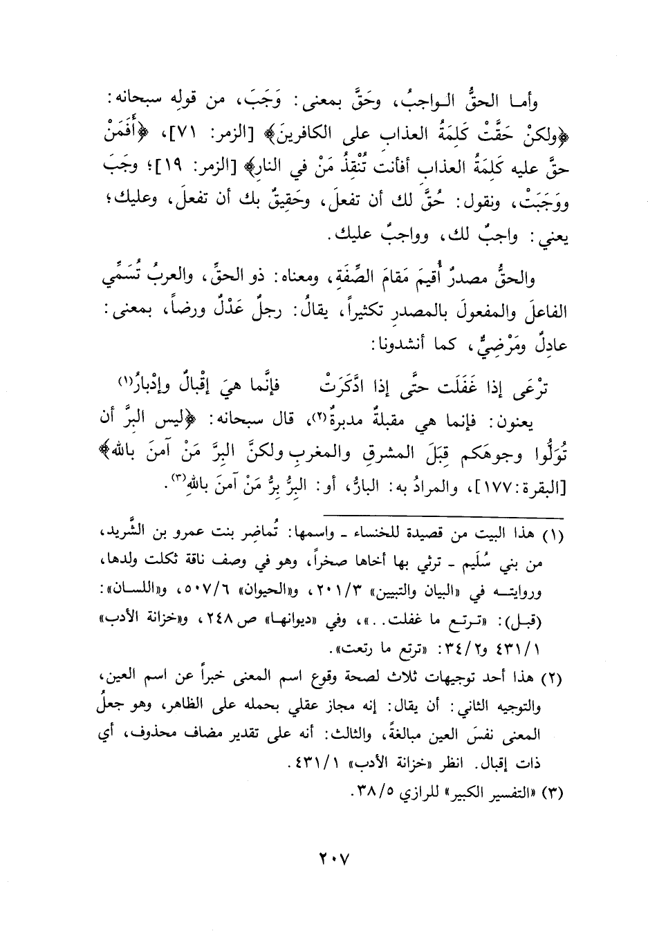 والحقُّ مصدرٌ أُقيمَ مَقامَ الصِّفَةِ، ومعناه: ذو الحقِّ، والعربُ تُسَمَّي الفاعلَ والمفعولَ بالمصدرِ تكثيراً، يقالُ: رجلٌ عَدْل ورضاً، بمعنى: عادِلٌ ومَرْضِيٌّ، كما أنشدونا: