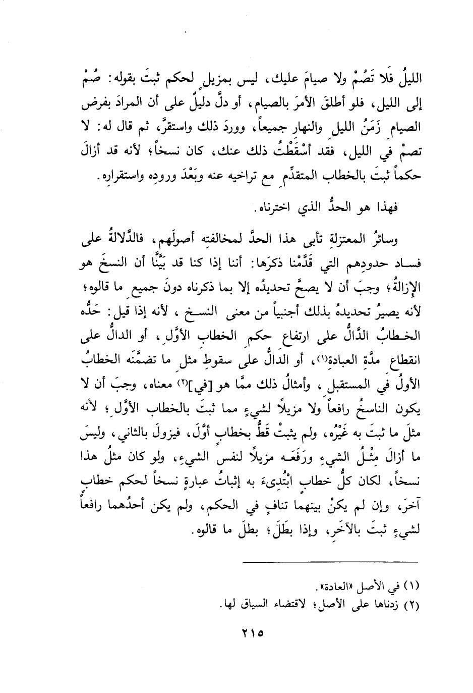 وسائرُ المعتزلةِ تأبى هذا الحدً لمخالفتِه أصولَهم، فالدَلالةُ على فساد حدودِهم التي قَدمْنا ذكرَها: أننا إذا كنا قد بَينَا أن النسخَ هو الإِزالةُ؛ وجبَ أن لا يصحَّ تحديدُه إلا بما ذكرناه دونَ جميعِ ما قالوه؛ لأنه يصيرُ تحديدهُ بذلك أجنبياً من معنى النسخ، لأنه إذا قيل: حَدُه الخطابُ الدَالُ على ارتفاعِ حكمِ الخطاب الأوَّلِ، أو الدالُ على انقطاعِ مدةِ العبادةِ (١)، أو الدالُ على سقوط مثلِ ما تضمَنَه الخطابُ الأولُ في المستقبلِ، وأمثالُ ذلك مما هو [في] (٢) معناه، وجبَ أن لا يكون الناسخُ رافعاً ولا مزيلاً لشيءٍ مما ثبتَ بالخطاب الأولِ؛ لأن مثلَ ما ثبتَ به غَيْرُه، ولم يثبتْ قَطُّ بخطابِ أولَ، فيزولَ بالثاني، وليسَ ما أزالَ مِثْل الشيءِ ورَفَعَه مزيلًا لنفسَ الشيءِ، ولو كان مثلُ هذا نسخاً، لكان كلُّ خطابٍ ابْتُدِىءَ به إثبات عبارةٍ نسخاً لحكم خطابٍ آخرَ، وإن لم يكنْ بينهما تنافٍ في الحكم، ولم يكن أحدُهما رافعاً لشيءٍ ثبتَ بالاَخَرِ، وإذا بطَل؛ بطلَ ما قالوه.
