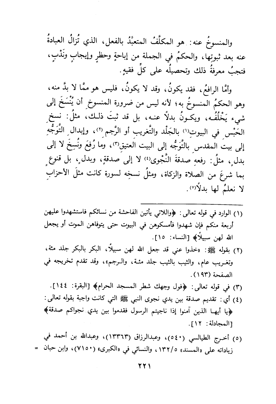 وأما الرافعُ، فقد يكونُ، وقد لا يكونُ، فليس هو ممَا لابد منه، وهو الحكمُ المنسوخُ به؛ لأنه ليس من ضرورة المنسوخِ أن يُنْسَخَ إلى شيء يَخْلُفُه، ويكونُ بدلًا عنه، بل قد ثبتَ ذلك، مثلُ: نسخِ الحَبْسِ في البيوتِ (١) بالجَلْد والتَغريب أو الرجم (٢)، وإبدالٍ التَّوَجُّهِ إلى بيت المقدسِ بالتَوَجُّه إلى البيت اَلعتيقِ (٣)، وَما رُفعَ ونُسِخَ لا إلى بدلٍ، مثلُ: رفعهِ صدقةَ النَّجْوى (٤) لا إلى صدقةٍ، وبدلٍ، بل قنوعٍ بما شرعَ من الصلاة والزكاة، ومثلُ نسخِه لسورة كانت مثلَ الأحزابِ لا نعلمُ لها بدلًا (٥).
