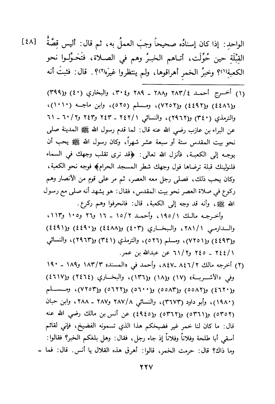 الواحدِ: إذا كان إسنادُه صحيصاً وجبَ العملُ به، ثم قال: أليس قِصَةُ القِبْلَةِ حين حوَلَت، أتاهم الخبرُ وهم في الصلاة، فتَحَوَلوا نحو الكعبةِ (١)؛ وخبر الخمرِ أهراقوها، ولم ينتظروا غيرَه (٢)؛. قال: فثبتَ أنه
