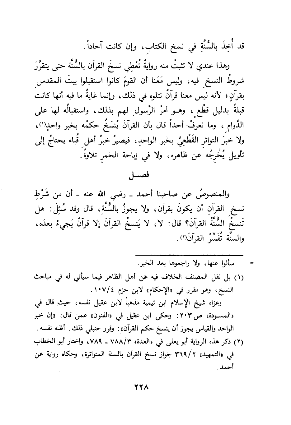 والمنصوصُ عن صاحبنا أحمد -رضي الله عنه- أن من شَرْطِ نسخِ القرآنِ أن يكونَ بقرآن، ولا يجوزُ بالسَنَّةِ، قال وقد سُئِلَ: هل تَنسخُ السّنَّةُ القرآنَ؟ قال: لا، لا يَنسخُ القرآنَ إلا قرآن يَجيءُ بعدَه، والسنَّة تُفَسِّرُ القرآنَ (٢).
