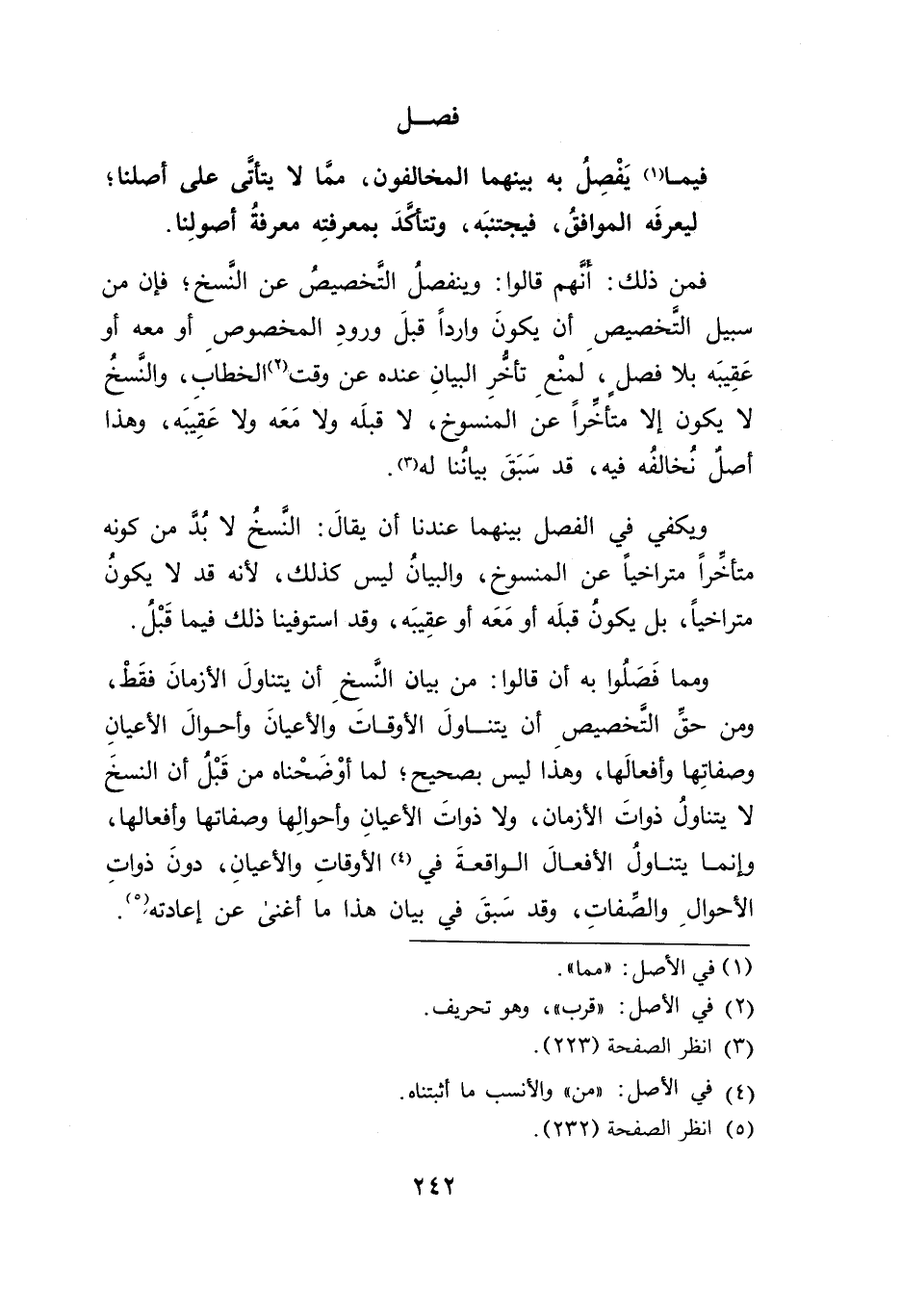 ومما فَصَلُوا به أن قالوا: من بيان النَسخِ أن يتناولَ الأزمانَ فقَطْ، ومن حقِّ التَّخصيصِ أن يتناولَ الأوقاتَ والأعيانَ وأحوالَ الأعيانِ وصفاتِها وأفعالَها، وهذا ليس بصحيح؛ لما أوْضَحْناه من قَبْلُ أن النسخَ لا يتناولُ ذواتَ الأزمان، ولا ذواتَ الأعيانِ وأحوالِها وصفاتها وأفعالها، وإنما يتناولُ الأفعالَ الواقعةَ في (٤) الأوقاتِ والأعيانِ، دونَ ذواتِ الأحوالِ والصِّفاتِ، وقد سَبقَ في بيان هذا ما أغنى عن إعادته (٥).