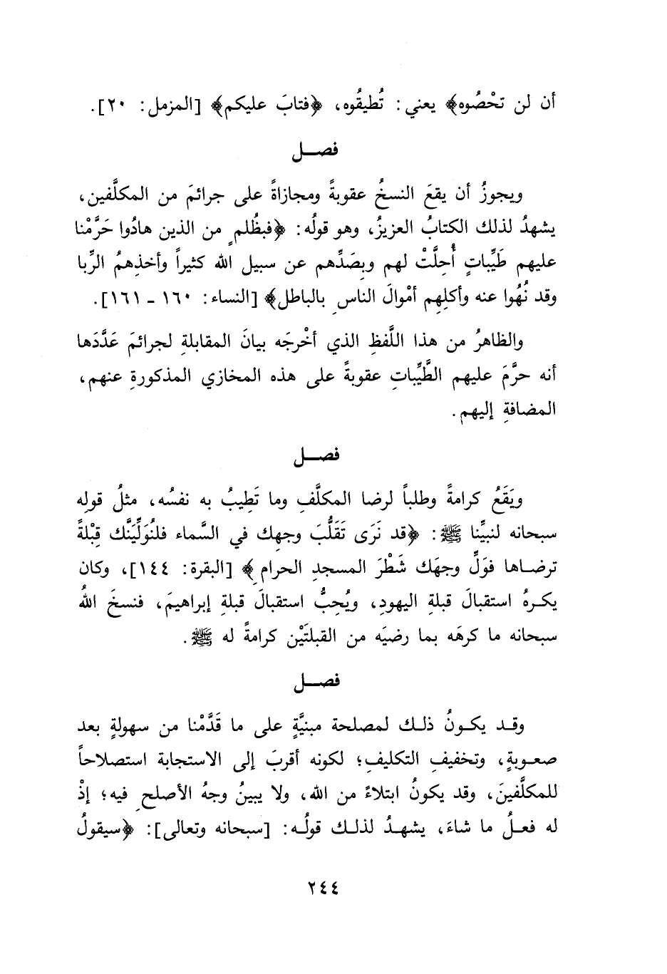 وقد يكونُ ذلك لمصلحة مبنيَّةٍ على ما قَدَّمْنا من سهولةٍ بعد صعوبةٍ، وتخفيفِ التكليفِ؛ لكونه أقربَ إلى الاستجابة استصلاحاً للمكلَّفينَ، وقد يكونُ ابتلاءً من الله، ولا يبينُ وجهُ الأصلحِ فيه؛ إذْ له فعلُ ما شاءَ، يشهدُ لذلك قولُه: [سبحانه وتعالى]: {سيقولُ