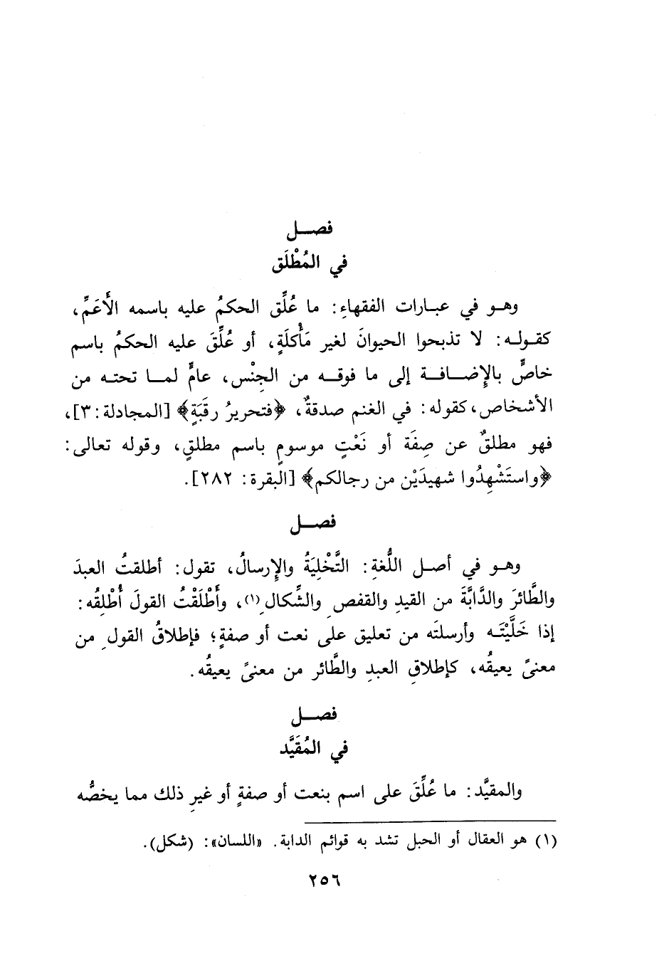 وهو في عبارات الفقهاءِ: ما عُلِّق الحكمُ عليه باسمه الأعَمِّ، كقوله: لا تذبحوا الحيوانَ لغير مَأْكلَةٍ، أو عُلَقَ عليه الحكمُ باسم خاصٍّ بالِإضافة إلى ما فوقه من الجِنْس، عامٍّ لما تحته من الأشخاص، كقوله: في الغنم صدقةٌ، {فتحريرُ رقَبَةٍ} [المجادلة: ٣]، فهو مطلق عن صِفَة أو نَعْتٍ موسومٍ باسم مطلقٍ، وقوله تعالى: {واستَشْهِدُوا شهيدَيْن من رجالكم} [البقرة: ٢٨٢].