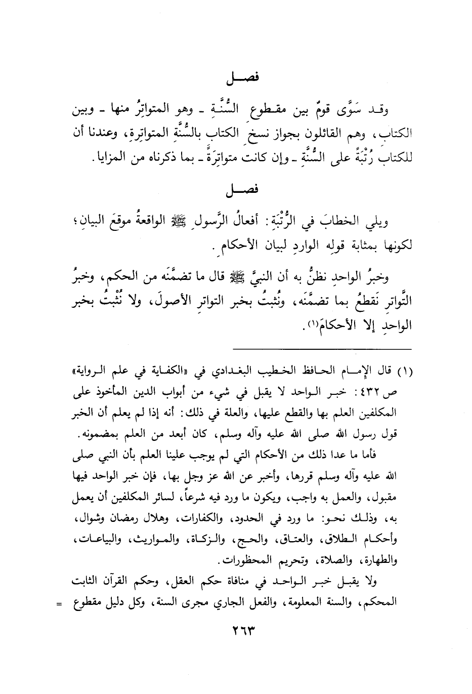 (١) قال الِإمام الحافظ الخطيب البغدادي في "الكفاية في علم الرواية" ص ٤٣٢: خبر الواحد لا يقبل في شيء من أبواب الدين المأخوذ على المكلفين العلم بها والقطع عليها، والعلة في ذلك: أنه إذا لم يعلم أن الخبر قول رسول الله صلى الله عليه وآله وسلم، كان أبعد من العلم بمضمونه. فأما ما عدا ذلك من الأحكام التي لم يوجب علينا العلم بأن النبي صلى الله عليه وآله وسلم قررها، وأخبر عن الله عز وجل بها، فإن خبر الواحد فيها مقبول، والعمل به واجب، ويكون ما ورد فيه شرعاً، لسائر المكلفين أن يعمل به، وذلك نحو: ما ورد في الحدود، والكفارات، وهلال رمضان وشوال، وأحكام الطلاق، والعتاق، والحج، والزكاة، والمواريث، والبياعات، والطهارة، والصلاة، وتحريم المحظورات.