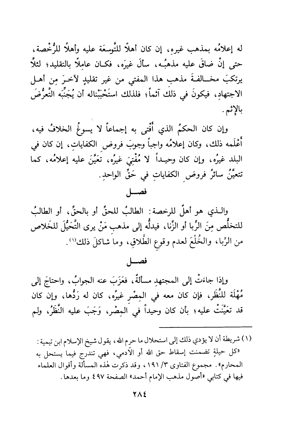 (١) شريطة أن لا يؤدي ذلك إلى استحلال ما حرم الله، يقول شيخ الإسلام ابن تيمية: "كل حيلةٍ تضمنت إسقاط حق الله أو الآدمي، فهي تندرج فيما يستحل به المحارم". مجموع الفتاوى ٣/ ١٩١، وقد ذكرت هذه المسألة وأقوال العلماء فيها في كتابي "أصول مذهب الإمام أحمد" الصفحة ٤٩٧ وما بعدها.