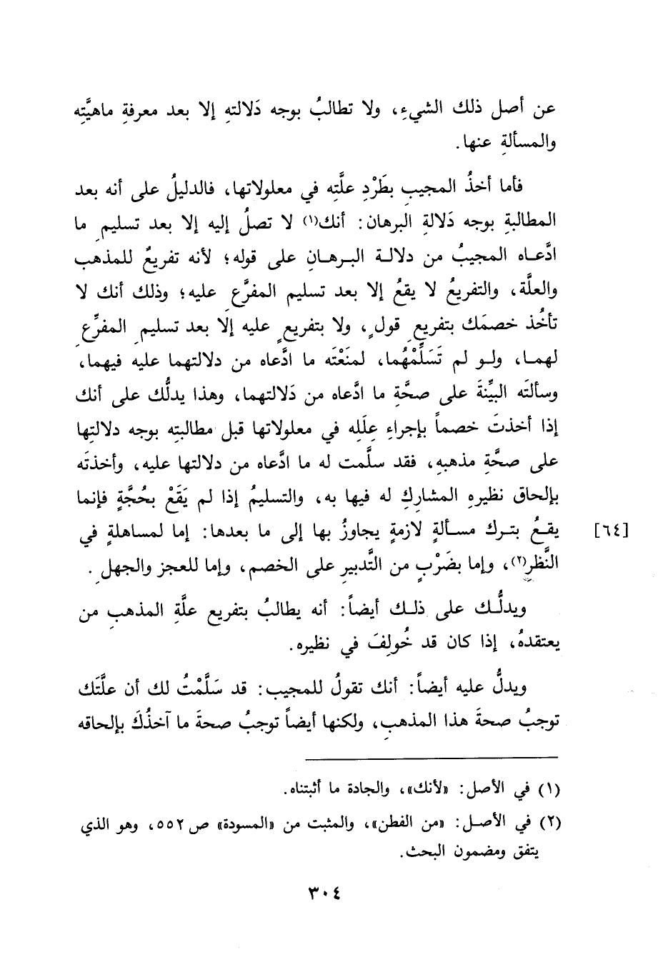 فأمَّا أخذُ المجيب بطَرْدِ علَّتِه في معلولاتها، فالدليلُ على أنه بعد المطالبةِ بوجه دَلالةِ الَبرهان: أنك (١) لا تصلُ إليه إلا بعد تسليمِ ما ادَّعاه المجيبُ من دلالة البرهانِ على قوله؛ لأنه تفريعٌ للمذهب والعلة، والتفريعُ لا يقعُ إلا بعد تسليم المفرَّع عليه؛ وذلك أنك لا تأخُذ خصمَك بتفريعِ قولٍ، ولا بتفريعٍ عليه إلَا بعد تسليمِ المفرِّعِ لهما، ولو لم تَسَلَمْهُما، لمنَعْتَه ما ادَّعاه من دلالتهما عليه فيهما، وسألتَه البينةَ على صحةِ ما ادَّعاه من دَلالتهما، وهذا يدلُك على أنك إذا أخذتَ خصماً بإجراءِ عِلَلِه في معلولاتها قبل مطالبتِه بوجه دلالتِها على صحَّةِ مذهبهِ، فقد سلمت له ما ادَّعاه من دلالتها عليه، وأخذتَه بإلحاق نظيرهِ المشارِكِ له فيها به، والتسليمُ إذا لم يَقَعْ بحُجَّةٍ فإنما يقِعُ بترك مسألةٍ لازمةٍ يجاوزُ بها إلى ما بعدها: إمَّا لمساهلةٍ في النَظرِ (٢)، وإما بضَرْبٍ من التَّدبيرِ على الخصم، وإما للعجز والجهلِ.