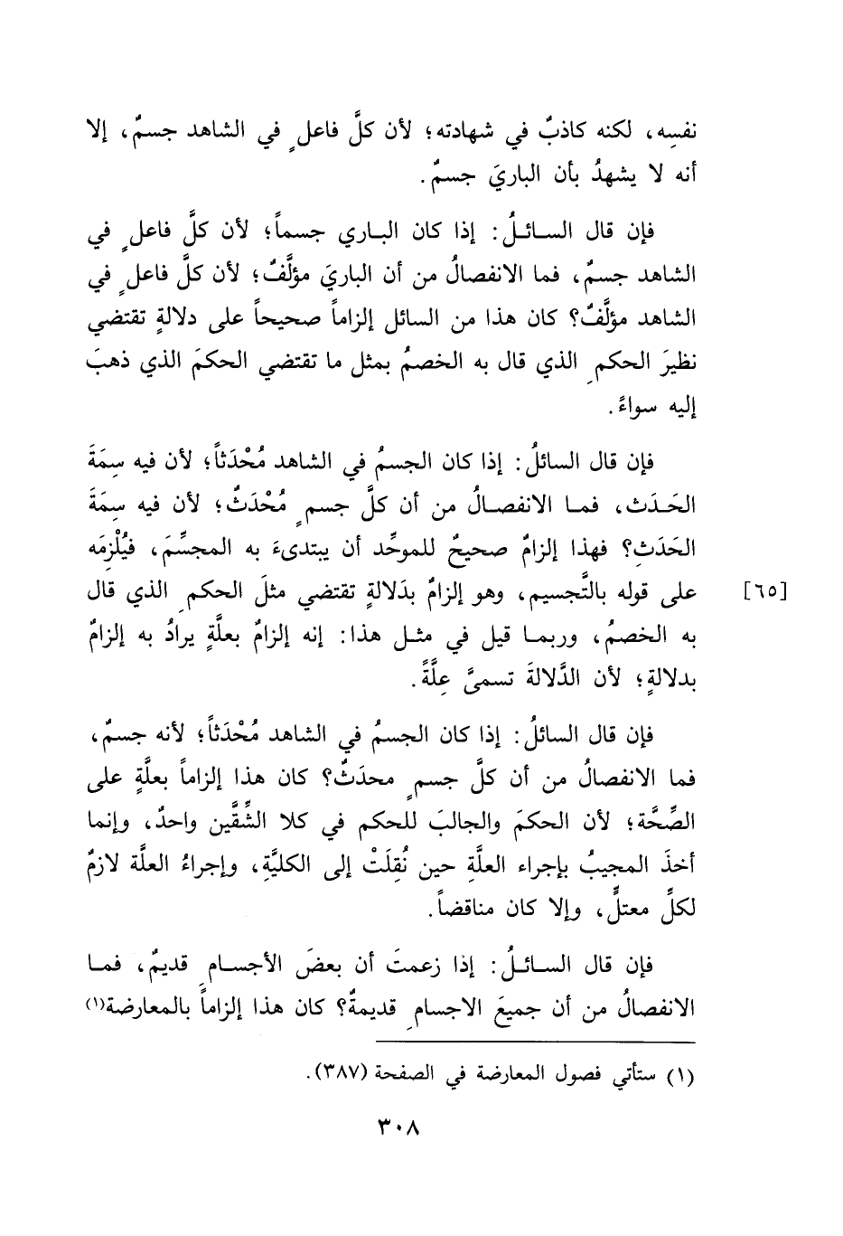 فإن قال السائلُ: إذا كان الجسمُ في الشاهد مُحْدَثاً؛ لأن فيه سِمَةَ الحَدَث، فما الانفصالُ من أن كلَّ جسمٍ مُحْدَث؛ لأن فيه سِمَةَ الحَدَثِ؟ فهذا إلزامٌ صحيحٌ للموحِّد أن يبتدىءَ به المجسِّمَ، فيُلْزِمَه على قوله بالتًجسيم، وهو إلزام بدَلالةٍ تقتضي مثلَ الحكمِ الذي قال به الخصمُ، وربما قيل في مثل هذا: إنه إلزامٌ بعلَّةٍ يرادُ به إلزامٌ بدلالةٍ؛ لأن الدلالةَ تسمىَّ عِلَّةً.