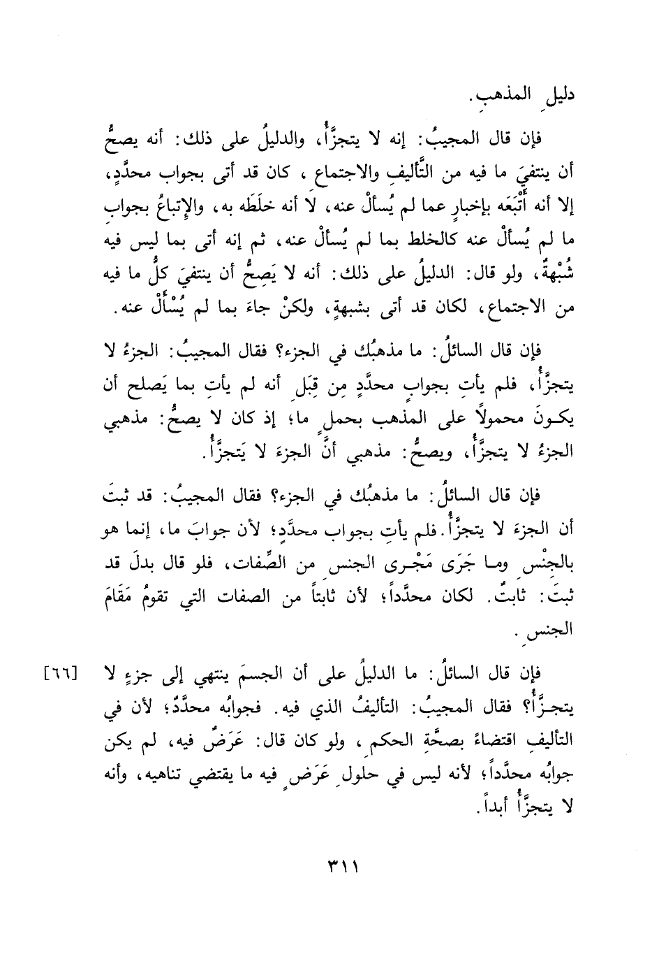 فإن قال المجيبُ: إنه لا يتجزَّأُ، والدليلُ على ذلك: أنه يصحُ أن ينتفيَ ما فيه من التَأليفِ والاجتماعِ، كان قد أتى بجواب محدَّدٍ، إلا أنه أتْبَعَه بإخبارٍ عما لم يُسأل عنه، لا أنه خلَطَه به، والإِتباعُ بجوابِ ما لم يُسألْ عنه كالخلط بما لم يُسألْ عنه، ثم إنه أتى بما ليس فيه شُبْهةٌ، ولو قال: الدليلُ على ذلك: أنه لا يَصِح أن ينتفيَ كلُّ ما فيه من الاجتماع، لكان قد أتى بشبهةٍ، ولكنْ جاءَ بما لم يُسْأَلْ عنه.