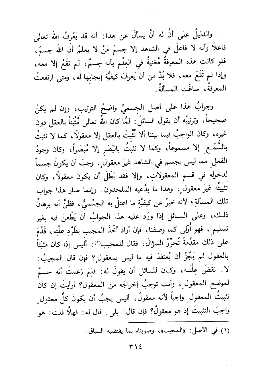 وجوابُ هذا على أصل الجِسميِّ واضحُ الترتيب، وإن لم يكنْ صحيحاً، وترتيبُه أن يقولَ السائلُ: لمَّا كان اللهُ تعالى مُثْبَتاً بالعقل دونَ غيرِه، وكان الواجبُ فيما بيننا ألا نُثْبِتَ بالعقل إلا معقولًا، كما لا نثبتُ بالسَّمْعِ إلا مسموعاً، وكما لا نثبتُ بالبَصَرِ إلا مُبْصَراً، وكان وجودُ الفعلِ مما ليس بجسم في الشاهد غيرَ معقولٍ، وجبَ أن يكونَ جسماً لدخوله في قسم المعقولاتِ، وإلا فقد بَطَلَ أن يكونَ معقولًا، وكان تثبيتُه غيرَ معقولٍ، وهذا ما يدعيه الملحدون. وإنما صار هذا جواب تلك المسالةِ؛ لأنه خبرٌ عن كيفيةِ ما اعتلَّ به الجسْميُّ، فظنَ أنه برهانُ ذلك، وعلى السائل إذا ورَدَ عليه هذا الجوابُ أن يَطْعنَ فيه بغير تسليمٍ، فهو أَولى كما وصفنا، فإن أرادَ أخْذَ المجيب بطَرْدِ علَّتِه، قَدَّمَ على ذلك مقدمةً تُحررُ السؤالَ، فقال للمجيب (١): ألَيس إذا كان مثبَتاً بالعقول لم يَجُزْ أن يُعتقدَ فيه ما ليس بمعقولٍ؟ فإن قال المجيبُ: لا. نقَضَ علتَه، وكان للسائل أن يقولَ له: فلِمَ زعمتَ أنه جسمٌ لموضع المعقولِ، وأنت توجبُ إخراجَه من المعقول؟ أرأيتَ إن كان تثبيتُ المعقولِ واجباً لأنه معقولٌ، أليس يجبُ أن يكونَ كل معقولٍ واجبَ التثبيتَ إذ هو معقولٌ؟ فإن قال: بلى. قال له: فهلَّا قلتَ: هو