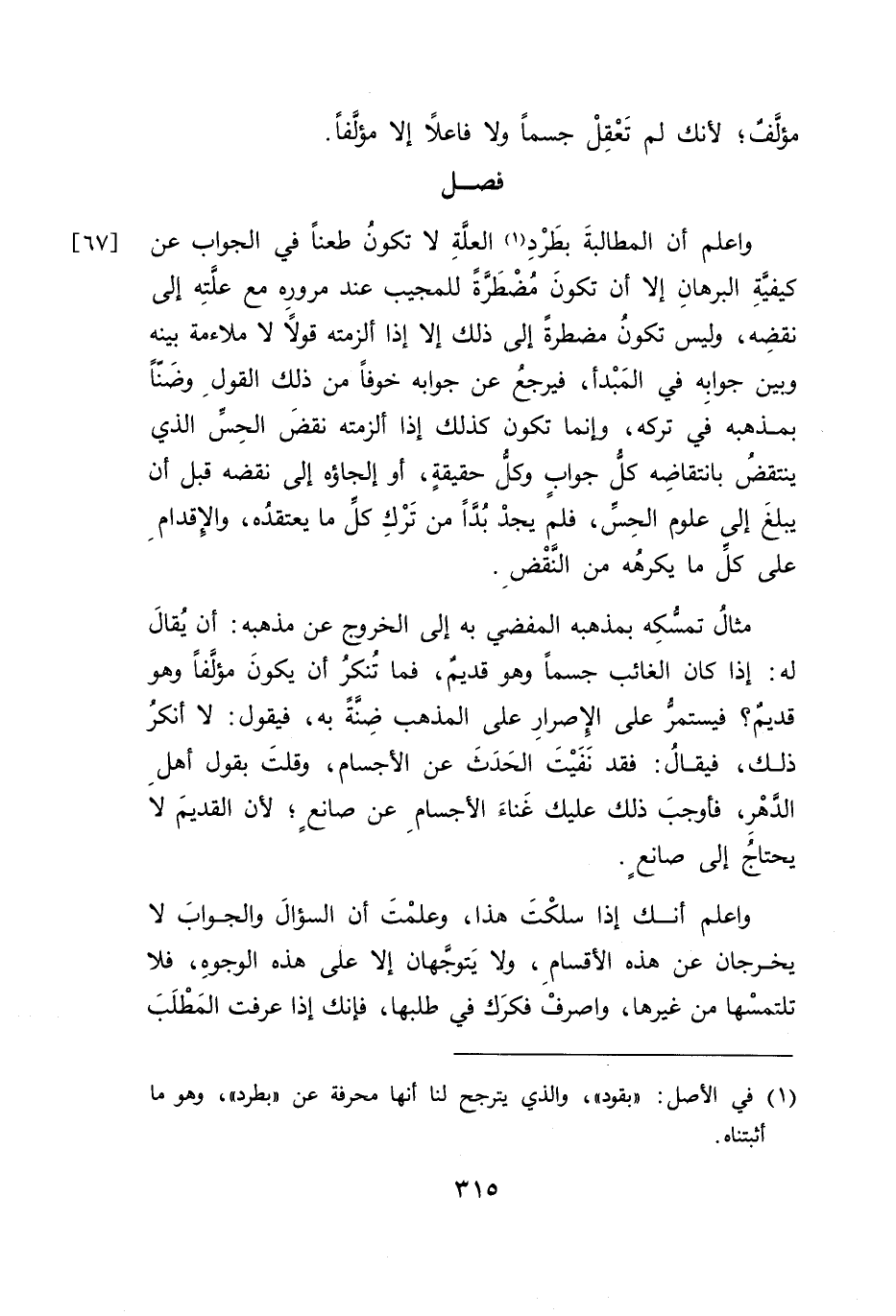 واعلم أن المطالبةَ بطَرْدِ (١) العلَّةِ لا تكونُ طعناً في الجواب عن كيفيةِ البرهانِ إلا أن تكونَ مُضْطَرَّةً للمجيب عند مرورِه مع علَّتِه إلى نقضِه، وليس تكونُ مضطرةً إلى، ذلك إلا إذا ألزمته قولًا لا ملاءمة بينه وبين جوابِه في المَبْدأ، فيرجعُ عن جوابه خوفاً من ذلك القولِ وضَنّاً بمذهبه في تركه، وإنما تكون، كذلك إذا ألزمته نقضَ الحِسِّ الذي ينتقضُ بانتقاضِه كل جوابِ وكلُّ حقيقةٍ، أو إلجاؤه إلى نقضه قبل أن يبلغَ إلى علوم الحِسِّ، فلمَ يجد بُدَّاً من تَرْكِ كلِّ ما يعتقدُه، والإِقدام على كلِّ ما يكرهُه من النَّقْضِ.
