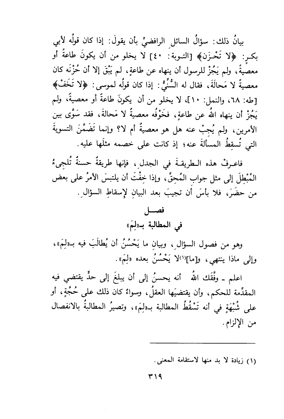 اعلم -وفَّقَك الله أنه يحسن إلى أن يبلغَ إلى حدٍّ يقتضي فيه المقدِّمة للحكم، وأن يقتضيَها العقل، وسواءٌ كان ذلك على حُجَّةٍ، أو على شبْهَةٍ في أنه تَسقطُ المطالبة بـ "لِمَ"، وتصير المطالبة بالانفصال من الإِلزام.