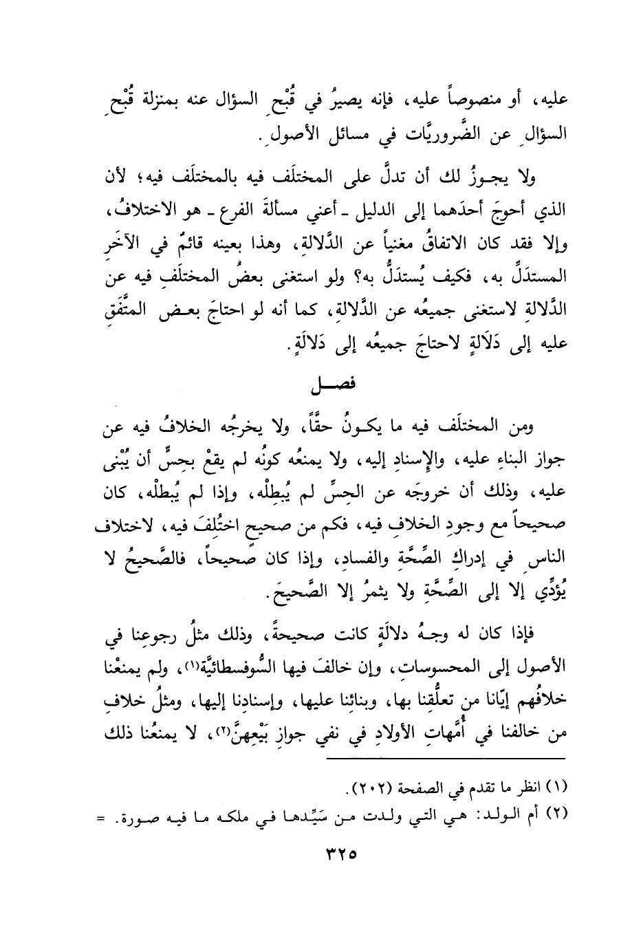 فإذا كان له وجهُ دلالَةٍ كانت صحيحةً، وذلك مثلُ رجوعِنا في الأصول إلى المحسوساتِ، وإن خالفَ فيها السُّوفسطائيَّة (١)، ولم يمنعْنا خلافُهم إيّانا من تعلقِنا بها، وبنائِنا عليها، وإسنادِنا إليها، ومثلُ خلافِ من خالفنا فرب امَّهاتِ الأولادِ في نفي جوازِ بَيْعِهنَّ (٢)، لا يمنعُنا ذلك