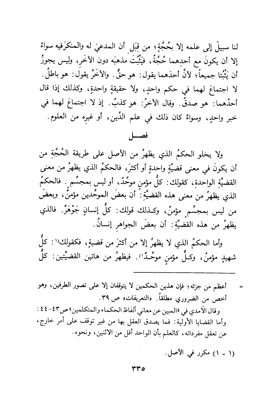 ولا يخلو الحكمُ الذي يظهرُ من الأصل على طريقة الحُجَّةِ من أن يكونَ فى معنى قضيةٍ واحدةٍ أو أكثرَ، فالحكمُ الذي يظهرُ من معنى القضيةِ الواحدةِ، كقولك: كلُّ مؤمنِ موحِّدٌ، أو ليس بمجسم. فالحكِمُ الذي يظهرُ من معنى هذه القضيةِ: أن بعضَ الموحِّدين مؤمن، وبعض من ليس بمجسِّمٍ مؤمنٌ، وكذلك قولك: كل إنسان جَوْهَر. فالذي يظهرُ من هذه القضيَّةِ: أن بعضَ الجواهرِ إنسانٌ.
