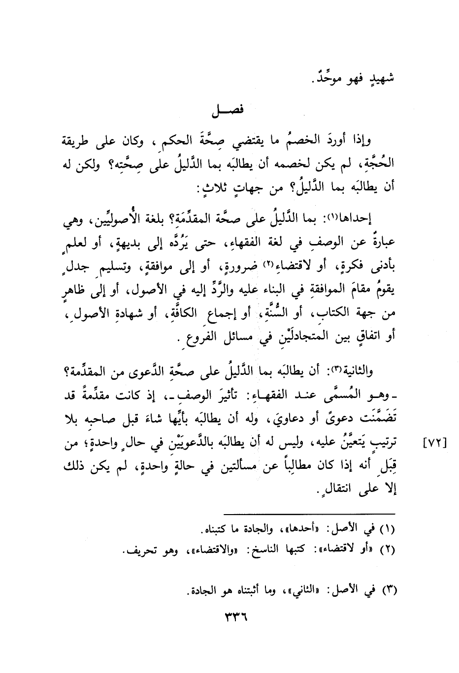 وإذا أوردَ الخصمُ ما يقتضي صِحَةَ الحكمِ، وكان على طريقة الحُجَّةِ، لم يكن لخصمه أن يطالبَه بما الدَّليل على صِحَّتِه؟ ولكن له أن يطالبَه بما الدليلُ؟ من جهاتٍ ثلاثٍ: