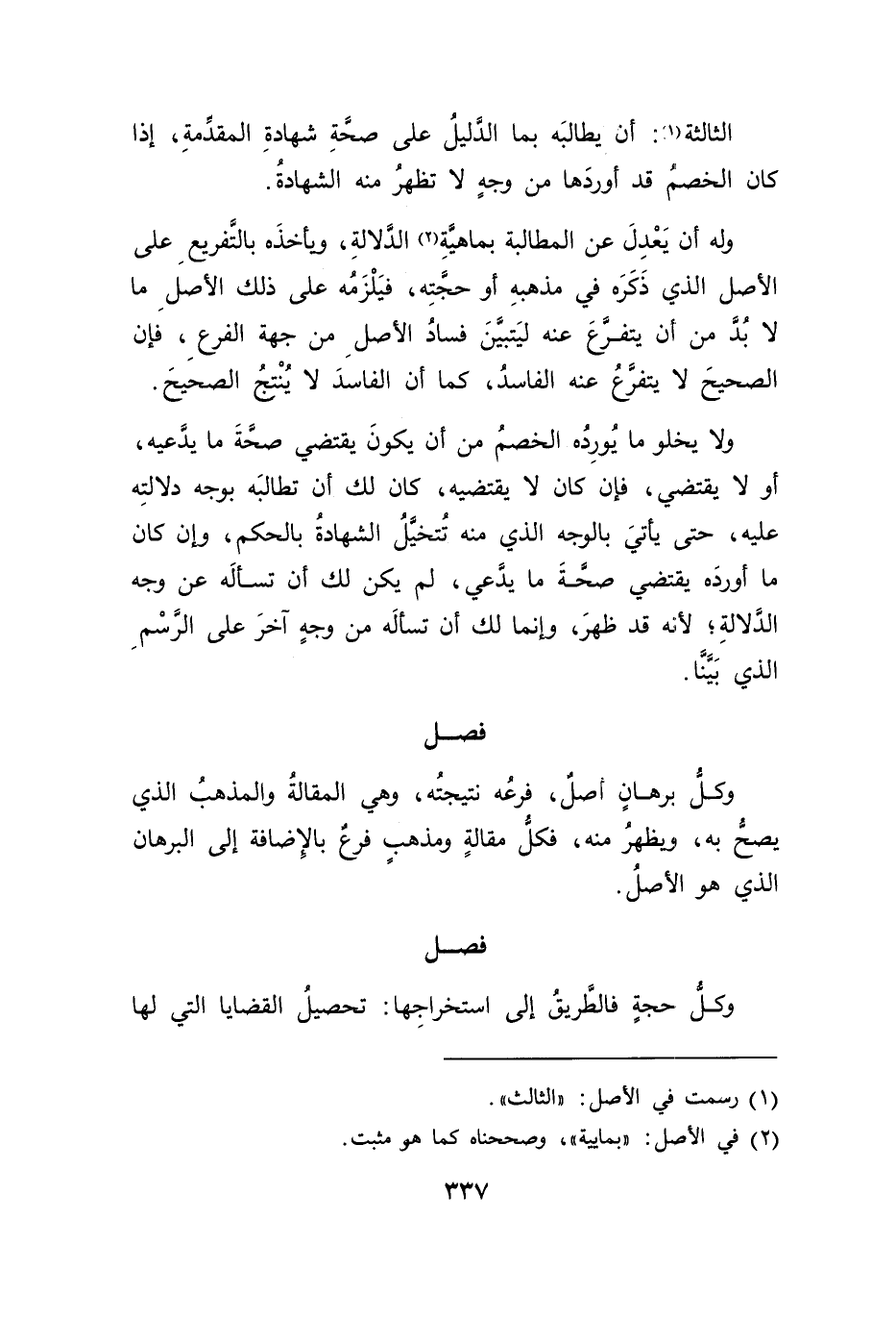 وله أن يَعْدِلَ عن المطالبة بماهيَّةِ (٢) الدَّلالةِ، ويأخذَه بالتَّفريع على الأصل الذي ذَكَرَه في مذهبهِ أو حجَّتِه، فيَلْزَمُه على ذلك الأصَلِ ما لا بُدَّ منْ أن يتفرع عنه ليَتبَّينَ فسادُ الأصلِ من جهة الفرع، فإن الصحيحَ لا يتفرعُ عنه الفاسدُ، كما أن الفاسدَ لا يُنْتجُ الصحَيحَ.