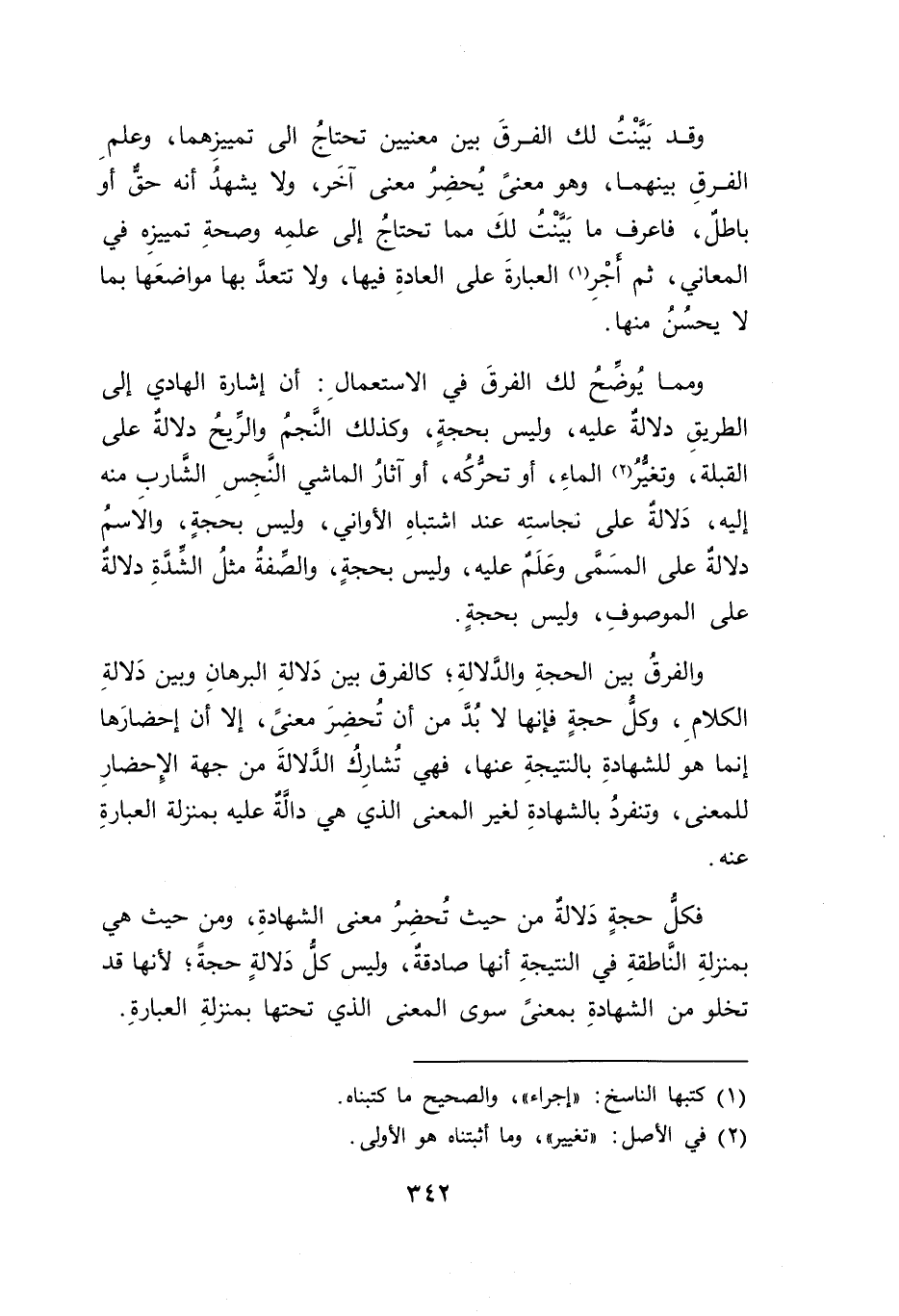 فكلُّ حجةٍ دَلالةٌ من حيث تُحضِرُ معنى الشهادةِ، ومن حيث هي بمنزلةِ النَّاطقةِ في النتيجةِ أنها صادقةٌ، وليس كل دَلالةٍ حجةً؛ لأنها قد تخلو من الشهادةِ بمعنىً سوى المعنى الذي تحتها بمنزلةِ العبارةِ.