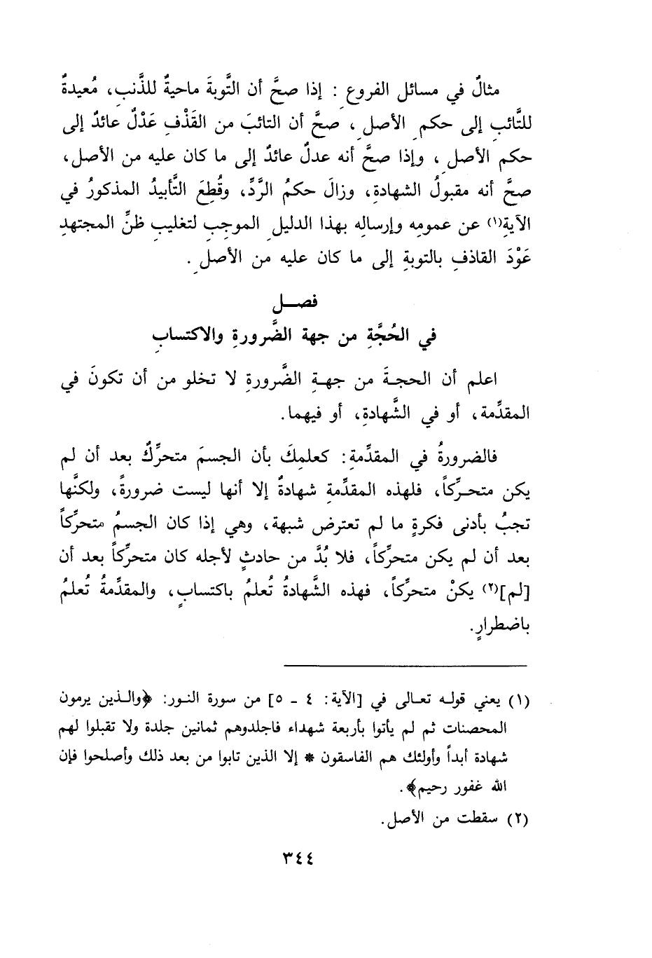 فالضرورةُ في المقدمةِ: كعلمِكَ بأن الجسمَ متحركٌ بعد أن لم يكن متحركاً، فلهذه المقدمةِ شهادةٌ إلا أنها ليست ضرورةً، ولكنَها تجبُ بأدنى فكرةٍ ما لم تعترض شبهة، وهي إذا كان الجسمُ متحركاً بعد أن لم يكن متحركاً، فلا بُد من حادثٍ لأجله كان متحركاً بعد أن [لم] (٢) يكنْ متحركاً، فهذه الشَهادةُ تُعلمُ باكتسابٍ، والمقدَمةُ تُعلمُ باضطرارٍ.