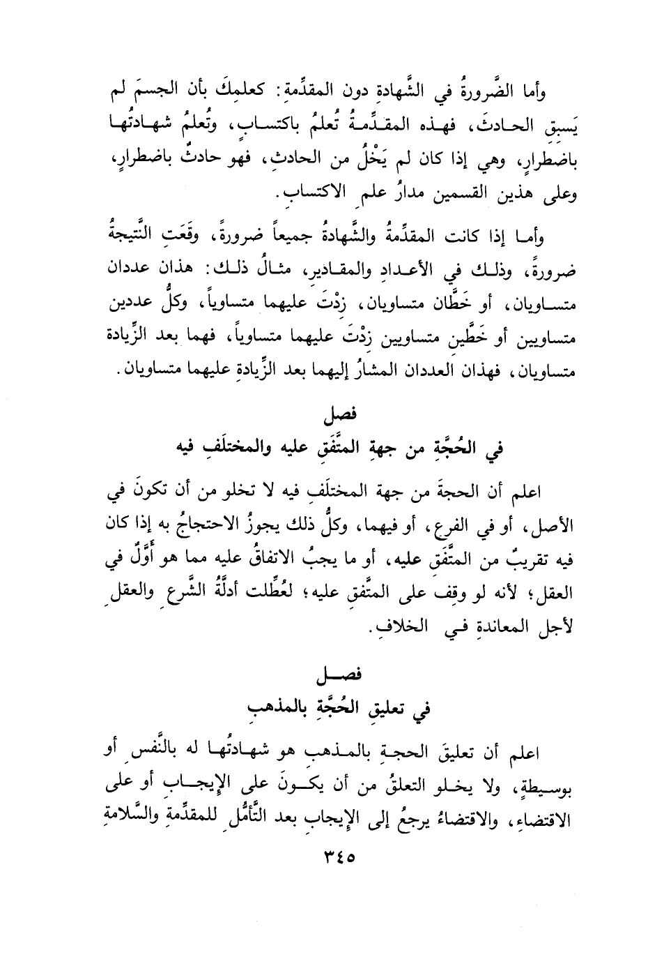 وأما إذا كانت المقدَمةُ والشَهادةُ جميعاً ضرورةً، وقَعَتِ النَتيجةُ ضرورةً، وذلك في الأعدادِ والمقاديرِ، مثالُ ذلك: هذان عددان متساويان، أو خَطَّان متساويان، زِدْتَ عليهما متساوياً، وكلُّ عددين متساويين أو خَطَّينِ متساويين زِدْتَ عليهما متساوياً، فهما بعد الزِّيادة متساويان، فهذان العددان المشارُ إليهما بعد الزِّيادةِ عليهما متساويان.