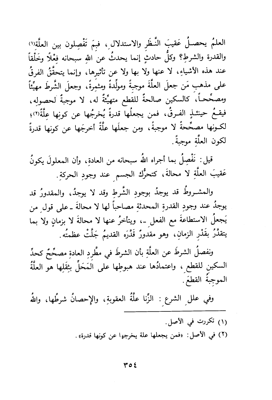 العلمُ يحصلُ عَقيبَ النَظَرِ والاستدلالِ، فبِمَ تَفْصِلون بين العلَّةِ (١) والقدرة والشرطِ؟ وكلُّ حادثٍ إنما يحدثُ عن اللهِ سبحانه فِعْلاً وخَلْقاً عند هذه الأشياءِ، لا عنها ولا بها ولا عن تأثيرِها، وإنما يتحقَقُ الفرقُ على مذهب مَن جعلَ العلَّةَ موجبةً ومولِّدةً ومثمِرةً، وجعلَ الشَرطَ مهيئاً ومصحِّحاً، كالسكين صالحةٌ للقَطع متهيِّئةٌ له، لا موجبةٌ لحصولِه، فيقعُ حينئذٍ الفرقُ، فمن يجعلُها قدرةٌ يُخرجُها عن كونِها عِلَّةً (٢)؛ لكونها مصحِّحةً لا موجبةً، ومن جعلَها علَّةً أخرجَها عن كونها قدرةً لكون العلَّةِ موجبةً.