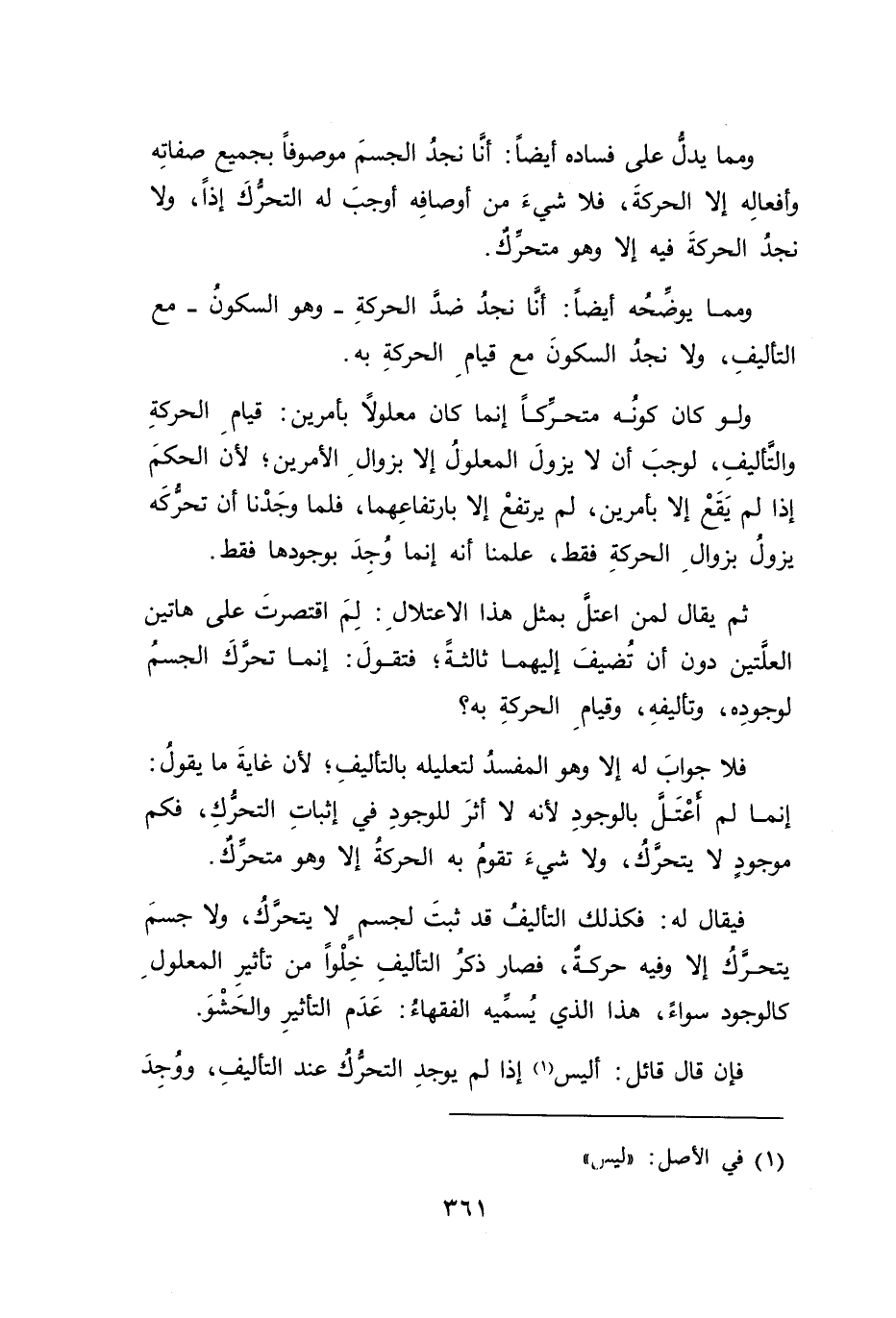 ولو كان كوُنه متحركاً إنما كان معلولًا بأمرين: قيام الحركةِ والتَّأليفِ، لوجبَ أن لا يزولَ المعلولُ إلا بزوالِ الأمرين؛ لأنَ الحكمَ إذا لم يَقَعْ إلا بأمرين، لم يرتفعْ إلا بارتفاعِهما، فلما وجَدْنا أن تحركَه يزولُ بزوالِ الحركةِ فقط، علمنا أنه إنما وُجِدَ بوجودها فقط.