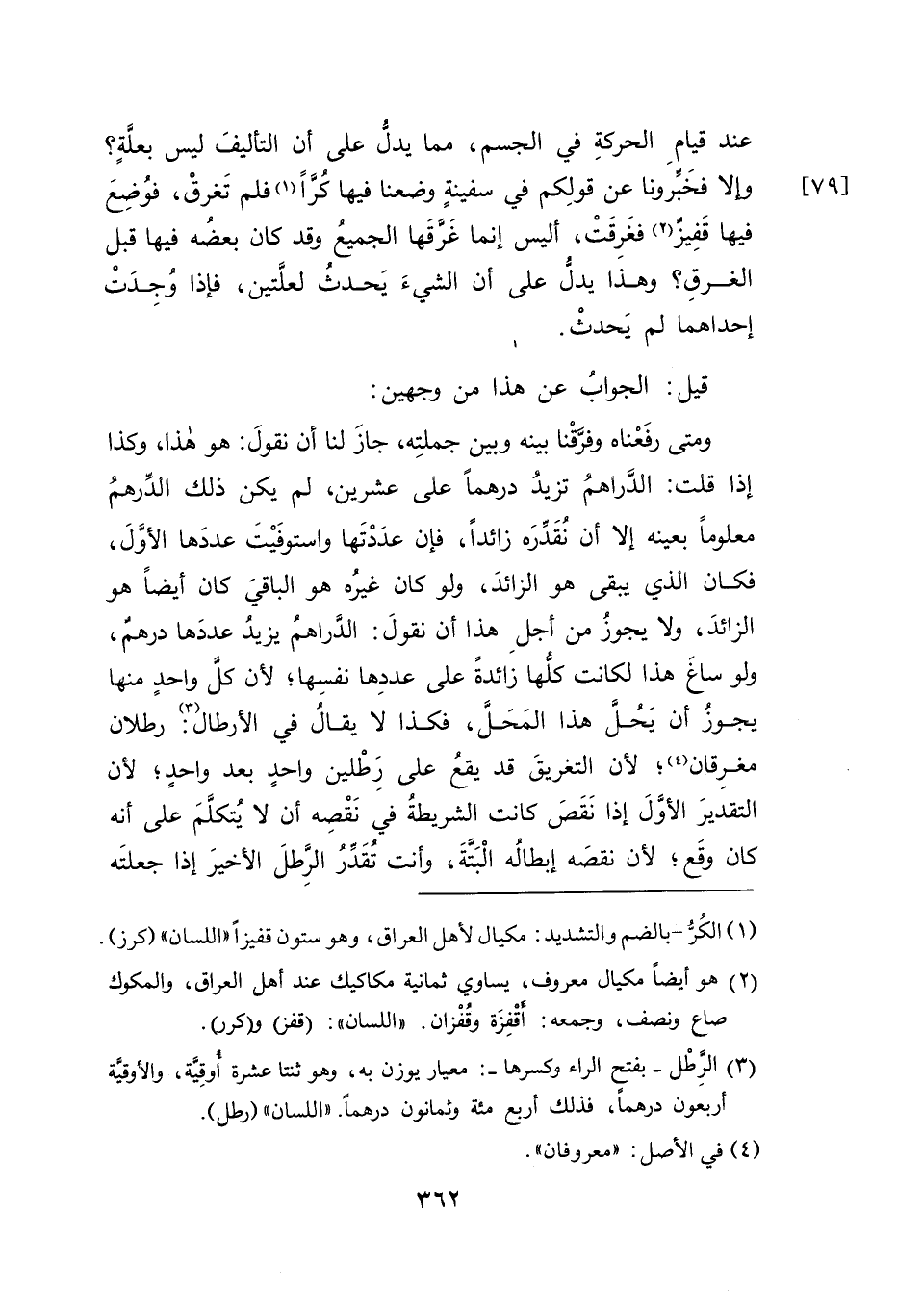 عند قيامِ الحركةِ في الجسم، مما يدلُ على أن التأليفَ ليس بعلَّةٍ؟ وإلا فخَبِّرونا عن قولِكم في سفينةٍ وضعنا فيها كُرَّاً (١) فلم تَغرقْ، فوُضِعَ فيها قَفِيزٌ (٢) فغَرِقَتْ، أليس إنما غَرَّقَها الجميعُ وقد كان بعضُه فيها قبل الغرقِ؟ وهذا يدلُّ على أن الشيءَ يَحدثُ لعلَّتين، فإذا وُجِدَتْ إحداهما لم يَحدثْ.