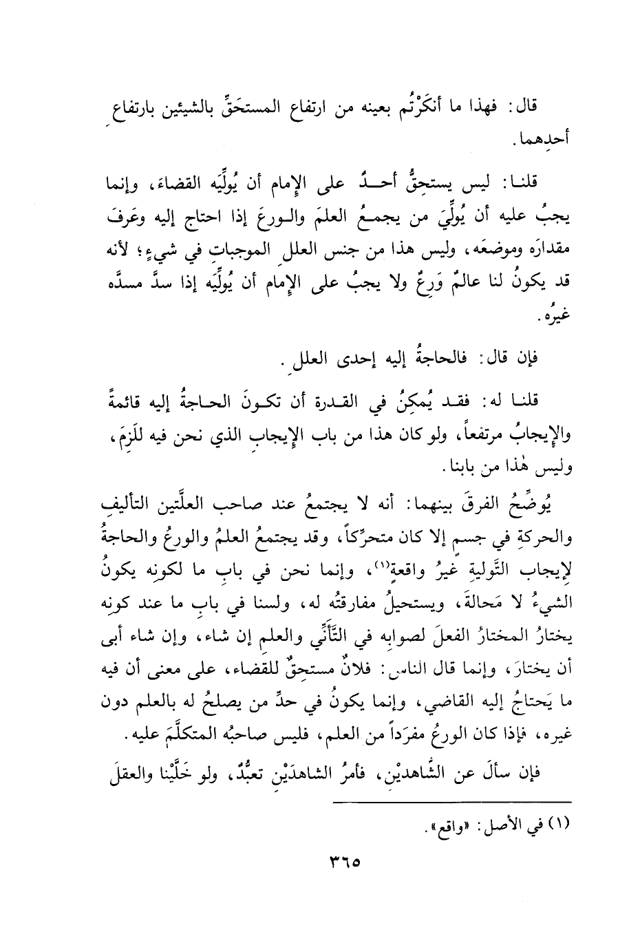 يُوضَحُ الفرقَ بينهما: أنه لا يجتمعُ عند صاحب العلَّتين التأليفِ والحركةِ في جسمٍ إلا كان متحرِّكاً، وقد يجتمعُ العلمُ والورعُ والحاجةُ لِإيجاب التَوليةِ غيرُ واقعة (١)، وإنما نحن في بابِ ما لكونه يكونُ الشيءُ لا مَحالةَ، ويستحيلُ مفارقتُه له، ولسنا في بابِ ما عند كونه يختارُ المختار والفعلَ لصوابِه في التَأَنِّي والعلمِ إن شاء، وإن شاء أبى أن يختارَ، وإنما قال للناس: فلانٌ مستحِق للقضاء، على معنى أن فيه ما يَحتاج إليه القاضي، وإنما يكونُ في حدِّ من يصلحُ له بالعلم دون غيره، فاذا كان الورعُ مفرَداً من العلم، فليس صاحبُه المتكلَّمَ عليه.