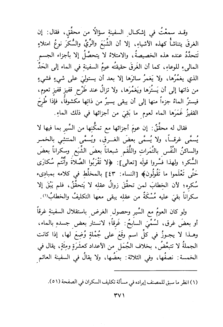 فقال له محقِّقٌ: إن عومَ أجزائها مع تمكُنِها من السَّيرِ بما فيها لا يُسمَّى غرقاً، ولا يُسمَّى بعضَ الغرقِ، وُيسمى المنتشِي بالخمر والساكن النَفْس بالتَمَراتِ واللقَمِ شبعاناً بعضَ الشَبَعِ وسكراناً بعضَ السكر؛ ولهذا فسَّروا قولَه [تعالى]: {لا تَقْرَبُوا الصلاةَ وانْتُم سُكارَى حَتَى تَعْلَموا ما تَقُولُون} [النساء: ٤٣] بالمخلِّطِ في كلامه بمبادِىء سُكرِه؛ لأن الخِطابَ لمن تحقَّقَ زوالُ عقلِه لا يَتحقَّقُ، فلم يَبْقَ إلا سكراناً بقيَ عليه مسْكَةٌ من عقلِه يبقى معها التكليف والخطابُ (١).