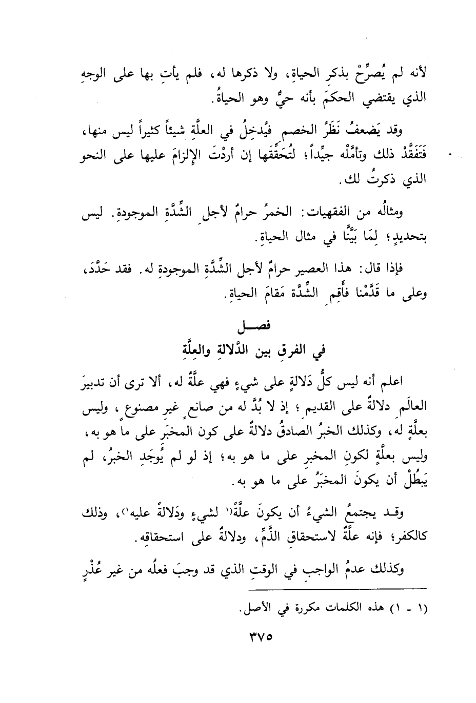 اعلم أنه ليس كلُّ دَلالةٍ على شيءٍ فهي علَّةُ له، ألا ترى ان تدبيرَ العالَمِ دلالةٌ على القديمِ؛ إذ لا بد له من صانعٍ غيرِ مصنوعٍ، وليس بعلةٍ له، وكذلك الخبرُ الصادقُ دلالةٌ على كون المخبَر على ما هو به، وليس بعلةٍ لكونِ المخبرِ على ما هو به؛ إذ لو لم يوجَدِ الخبرُ، لم يَبطُلْ أن يكونَ المخبَرُ على ما هو به.