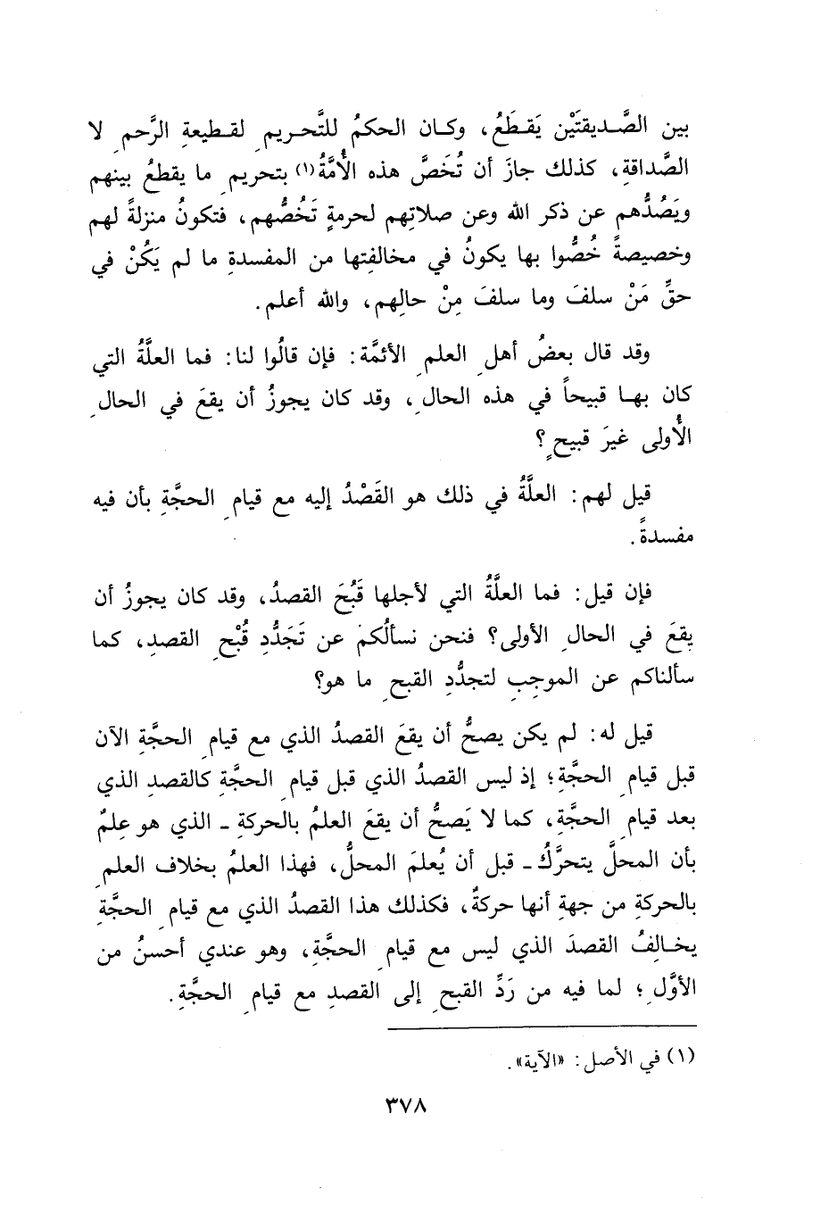 وقد قال بعضُ أهلِ العلمِ الأئمة: فإن قالُوا لنا: فما العلَّةُ التي كان بها قبيحاً في هذه الحالِ، وقد كان يجوزُ أن يقعَ في الحالِ الأُولى غيرَقبيحٍ؟