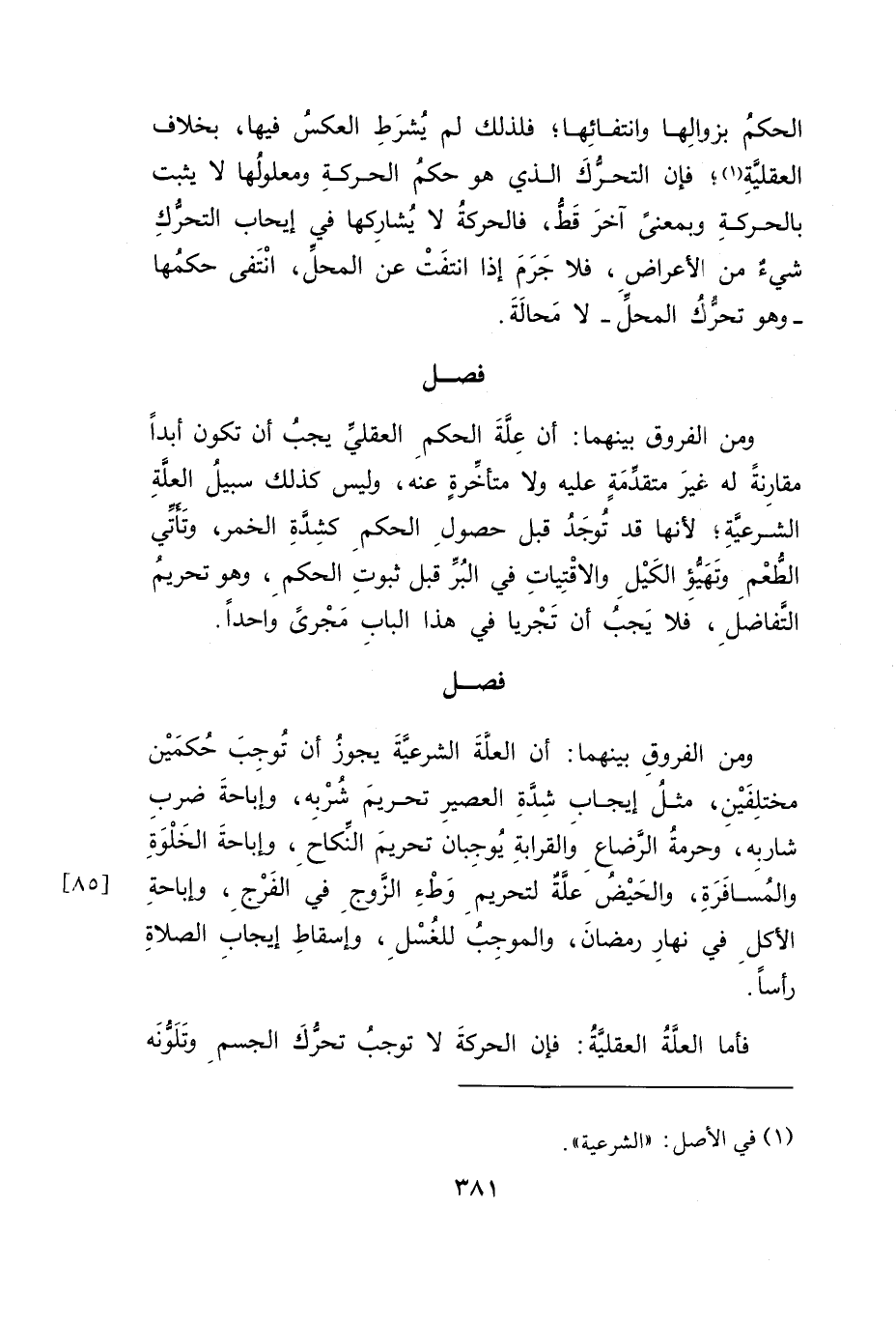 الحكمُ بزوالِها وانتفائِها؛ فلذلك لم يُشرَطِ العكسُ فيها، بخلاف العقليَّةِ (١) فإن التحرُّكَ الذي هو حكمُ الحركةِ ومعلولُها لا يثبت بالحركةِ وبمعنىً آخرَ قَطُّ، فالحركةُ لا يُشارِكها في إيحاب التحركِ شيء من الأعراضِ، فلا جَرَمَ إذا انتفَتْ عن المحل، انْتَفى حكمُها -وهو تحرك المحل- لا مَحالَةَ.