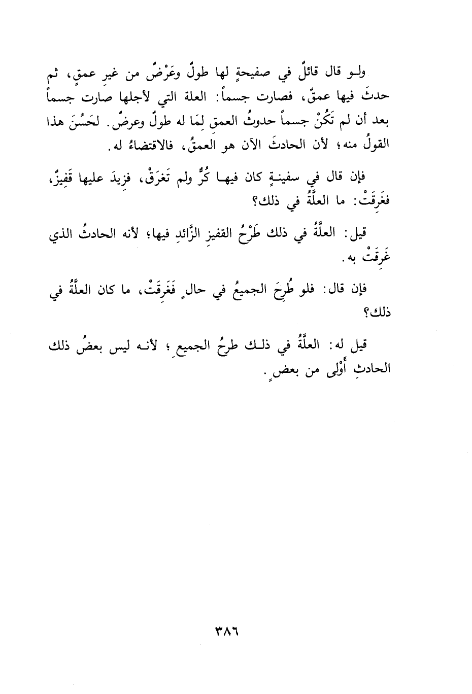 ولو قال قائل في صفيحةٍ لها طولٌ وعَرْض من غيرِ عمقٍ، ثم حدثَ فيها عمقٌ، فصارت جسماً: العلَّة التي لأجلها صارت جسماً بعد أن لم تَكُنْ جسماً حدوثُ العمقِ لِمَا له طولٌ وعرضٌ. لحَسُنَ هذا القولُ منه؛ لأن الحادثَ الآن هو العمقُ، فالاقتضاءُ له.