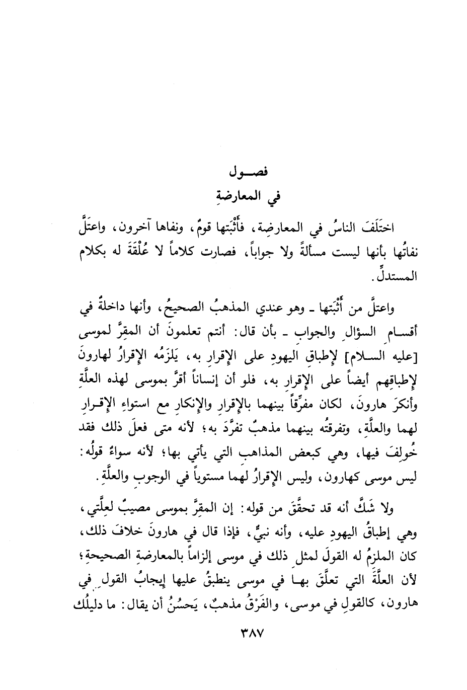 ولا شَك أنه قد تحقَقَ من قوله: إن المقِرَّ بموسى مصيب لعِلَّتي، وهي إطباقُ اليهودِ عليه، وأنه نبيٌّ، فإذا قال في هارونَ خلافَ ذلك، كان الملزِمُ له القولَ لمثلِ ذلك في موسى إلزاماً بالمعارضةِ الصحيحةِ؛ لأن العلَّةَ التي تعلقَ بها في موسى ينطبقُ عليها ايجابُ القولِ في هارون، كالقولِ في موسى، والفَرْقُ مذهبٌ، يَحسُنُ أن يقال: ما دليلُك