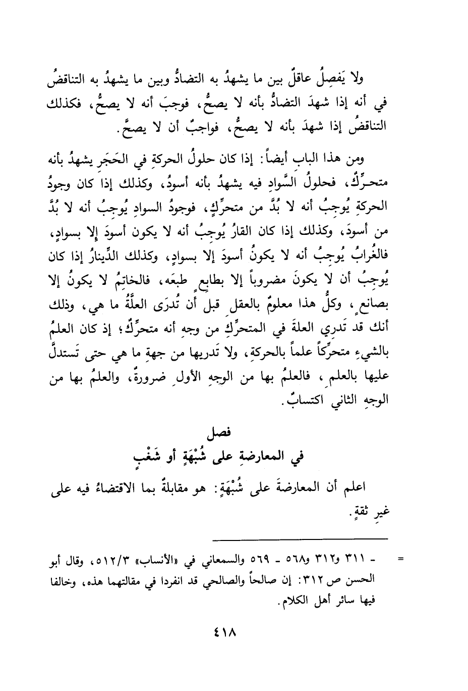 ومن هذا الباب أيضاً: إذا كان حلولُ الحركةِ في الحَجَرِ يشهدُ بأنه متحرك، فحلولُ اَلسوادِ فيه يشهدُ بأنه أسودُ، وكذلك إذا كان وجودُ الحركةِ يُوجِبُ أنه لا بُد من متحركٍ، فوجودُ السوادِ يُوجِبُ أنه لا بُد من أسودَ، وكذلك إذا كان القارُ يُوجبُ أنه لا يكون أسودَ إِلا بسوادٍ، فالغُرابُ يُوجِبُ أنه لا يكونُ أسودَ إلَا بسوادٍ، وكذلك الدَينارُ إذا كان يُوجِبُ أن لا يكونَ مضروباً إلا بطابِعٍ طبعَه، فالخاتِمُ لا يكونُ إلا بصانعٍ، وكلُّ هذا معلومٌ بالعقلِ قبل أن تُدرَى العلَّةُ ما هي، وذلك أنك قد تَدرِي العلَّةَ في المتحرِّكِ من وجهِ أنه متحركٌ؛ إذ كان العلمُ بالشيءِ متحرَكاً علماً بالحركةِ، ولا تَدريها من جهةِ ما هي حتى تَستدل عليها بالعلمِ، فالعلمُ بها من الوجهِ الأولِ ضرورةٌ، والعلمُ بها من الوجهِ الثاني اكتسابٌ.