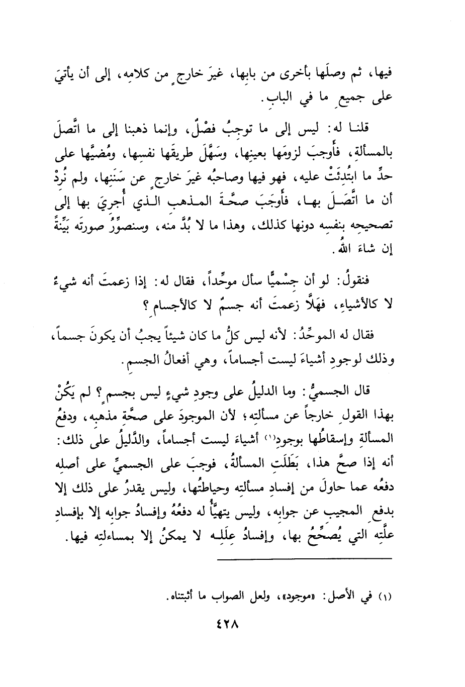 قال الجسميُّ: وما الدليلُ على وجودِ شيءٍ ليس بجسمٍ؟ لم يَكُنْ بهذا القولِ خارجاً عن مسألتِه؛ لأن الموجودَ على صحَّةِ مذهبه، ودفعُ المسألةِ وإسقاطُها بوجودِ (١) أشياءَ ليست أجساماً، والدَليلُ علىَ ذلك: أنه إذا صحَ هذا، بَطَلَتِ المسألةُ، فوجبَ على الجسمى على أصلِه دفعُه عما حاولَ من إفسادِ مسألتِه وحياطتُها، وليس يقدرُ على ذلك إلا بدفعِ المجيبِ عن جوابه، وليس يتهيَّأ له دفعُهُ وإفسادُ جوابه إلا بإفسادِ علَّتِه التي يُصححُ بها، وإفسادُ عِلَلِه لا يمكنُ إلا بمساَءلتِه فيها.