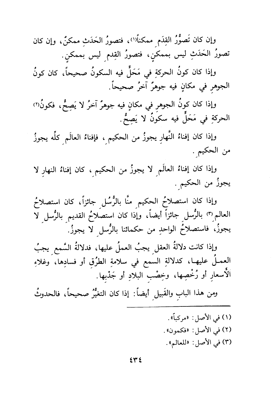 وإذا كان استصلاح الحكيمِ منَّا بالرُسلِ جائزاً، كان استصلاحُ العالم (٣) بالرسلِ جائزاَ أيضاً، وإذا كان استصلاحُ القديمِ بالرُّسلِ لا يجوزُ، فاستصلاحُ الواحدِ من حكمائنا بالرسلِ لا يجوزُ.