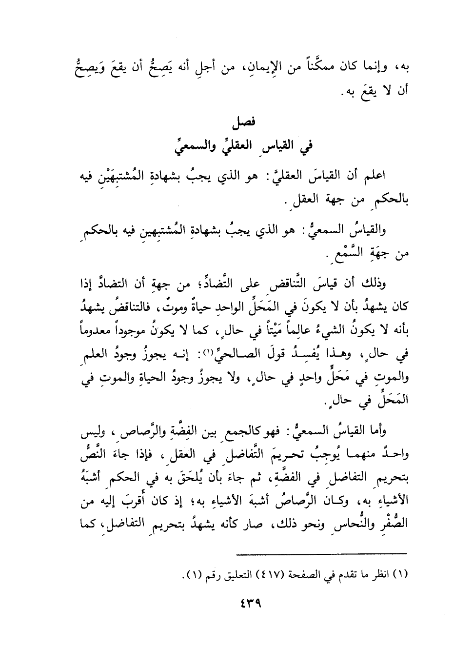 وذلك أن قياسَ التَّناقضِ على التَّضادِّ؛ من جهةِ أن التضادَّ إذا كان يشهدُ بأن لا يكونَ في المَحَل الواحدِ حياةٌ وموتٌ، فالتناقض يشهدُ بأنه لا يكونُ الشيءُ عالِماً مَيْتاً في حالٍ، كما لا يكوَن موجوداً معدوماً في حالٍ، وهذا يُفسِد قولَ الصالحيِّ (١): إنه يجوز وجود العلمِ والموتِ في مَحَل واحدٍ في حالٍ، ولا يجوز وجود الحياةِ والموتِ في المَحَل في حالٍ.