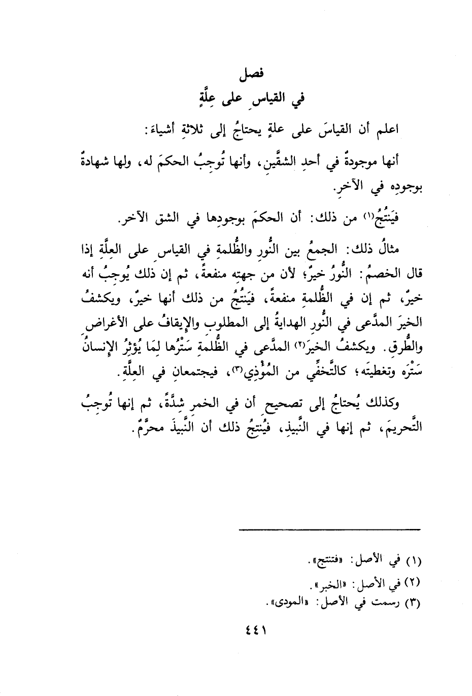 اعلم أن القياسَ على علَّةُ يحتاجُ إلى ثلاثةِ أشياءَ:
