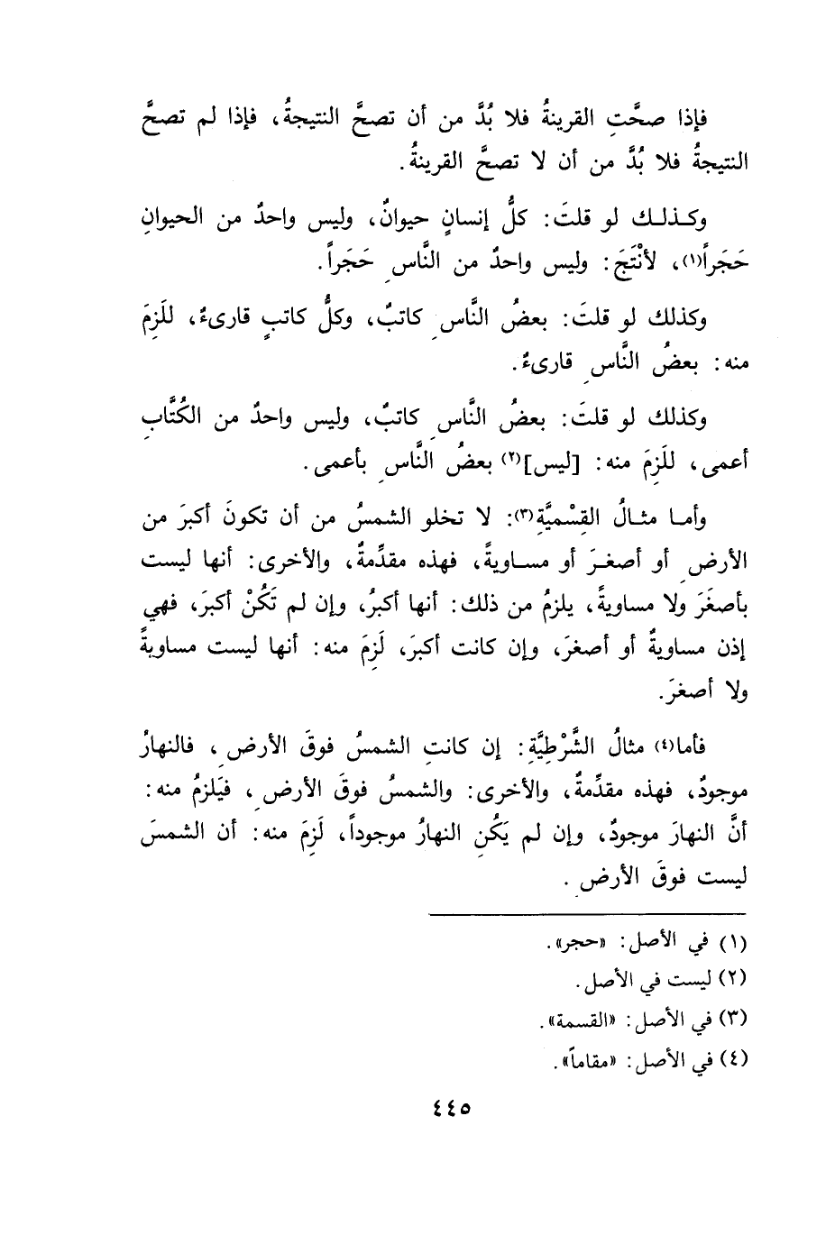 وأما مثالُ القِسْميةِ (٣): لا تخلو الشمسُ من أن تكونَ أكبرَ من الأرضِ أو أصغرَ أو مساويةً، فهذه مقدَمةٌ، والأخرى: أنها ليست بأصغَرَ ولا مساويةً، يلزمُ من ذلك: أنها أكبرُ، وإن لم تَكُنْ أكبرَ، فهيٍ إذن مساويةٌ أو أصغرَ، وإن كانت أكبرَ، لَزِمَ منه: أنها ليست مساوبةً ولا أصغرَ.