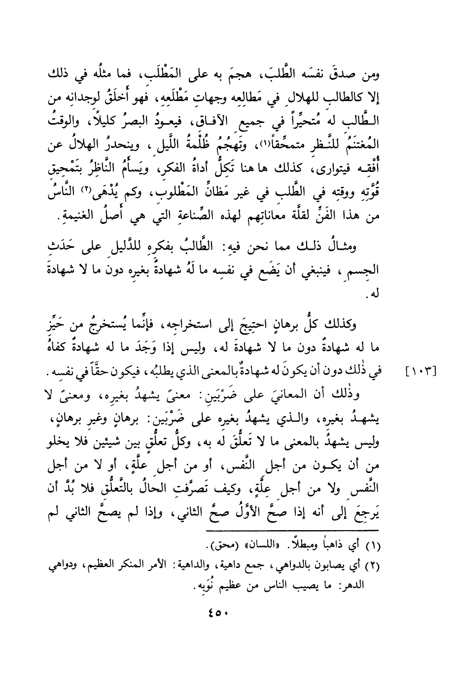 ومن صدقَ نفسَه الطلبَ، هجمَ به على المَطْلَب، فما مثلُه في ذلك إلا كالطالب للهلالِ في مَطالِعِه وجهاتِ مَطْلَعِهِ، فَهو اخلَقُ لوِجدانِه من الطَّالب لهَ مُتحيراً في جميعِ الآفاقِ، فيعودُ البصرُ كليلاً، والوقت المُغتنَم للنَظرِ متمحِّقاً (١)، وتَهجُمُ ظلْمةُ الليلِ، وينحدرُ الهلالُ عن أفْقِه فيتوارى، كذلك ها هنا تَكِلُ أداةُ الفكرِ، وَيسأمُ النَاظِرُ بتَمْحِيقِ قُوتِهِ ووقتِه في الطَّلب في غير مَظانِّ المَطْلوب، وكم يُدْهَى (٢) النَّاسُ من هذا الفَنِّ لقلَّة معَاناتِهم لهذه الصِّناعةِ التيَ هي أصلُ الغنيمةِ.