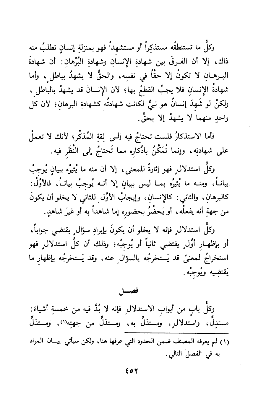 وكل ما تستنطقُه مستذكِراً أو مستشهِداً فهو بمنزلةِ إنسان تطلبُ منه ذاك، إلا أن الفرقَ بين شهادةِ الإنسانِ وشهادةِ البُرْهانِ: أن شهادةَ البرهانِ لا تكونُ إلا حقَاً في نفسِه، والحق لا يشهدُ بباطل، وأما شهادةُ الِإنسانِ فلا يجبُ القطعُ بها؛ لأن الإِنسانَ قد يشهدُ بالباطلِ، ولكنْ لو شَهِدَ إنسان هو نبي لكانت شهادتُه كشهادةِ البرهانِ؛ لأن كلُّ واحدٍ منهما لا يشهدُ إلا بحقٍّ.