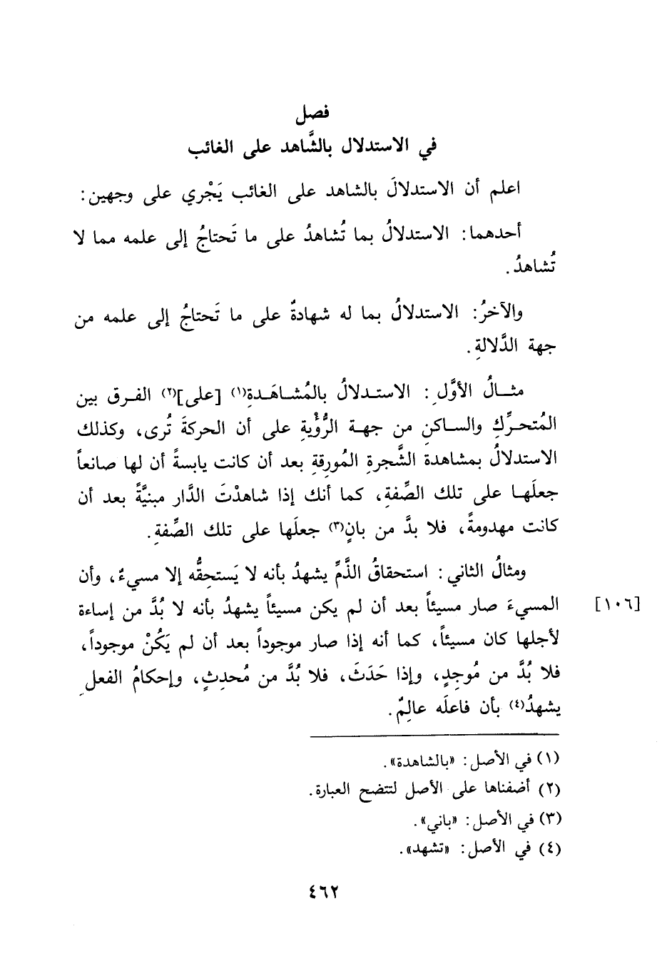اعلم أن الاستدلادَ بالشاهد على الغائب يَجْري على وجهين: أحدهما: الاستدلالُ بما تُشاهدُ على ما تَحتاجُ إلى علمه مما لا تُشاهدُ.