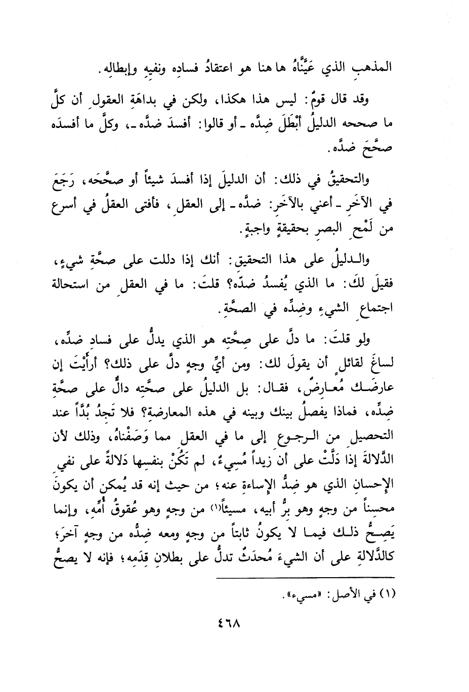 ولو قلتَ: ما دل على صِحَّتِه هو الذي يدلُّ على فسادِ ضدِّه، لساغَ لقائلٍ أن يقولَ لك: ومن أيِّ وجهٍ دل على ذلك؛ أرايتَ إن عارضَك مُعارِض، فقال: بل الدليلُ على صحَّتِه دال على صحَّةِ ضِدِّه، فماذا يفصلُ بينك وبينه في هذه المعارضةِ؛ فلا تَجِدُ بُدَّاً عند التحصيلِ من الرجوعِ إلى ما في العقلِ مما وَصَفْناهُ، وذلك لأن الدَّلالةَ إذا دَلَّتْ على أن زيداً مُسِيء، لم تَكُنْ بنفسِها دَلالةً على نفيِ الإِحسانِ الذي هو ضِدًّ الإِساءةِ عنه؛ من حيث إنه قد يُمكن أن يكونَ محسِناً من وجهٍ وهو بِرُّ أبيه، مسيئاً (١) من وجهٍ وهو عُقوقُ أمِّهِ، وإنما يَصح ذلك فيما لا يكونُ ثابتاً من وجهٍ ومعه ضِدُّه من وجهٍ آخرَ؛ كالدَّلالةِ على أن الشيءَ مُحدَث تدلُّ على بطلانِ قِدَمِه؛ فإنه لا يصحًّ
