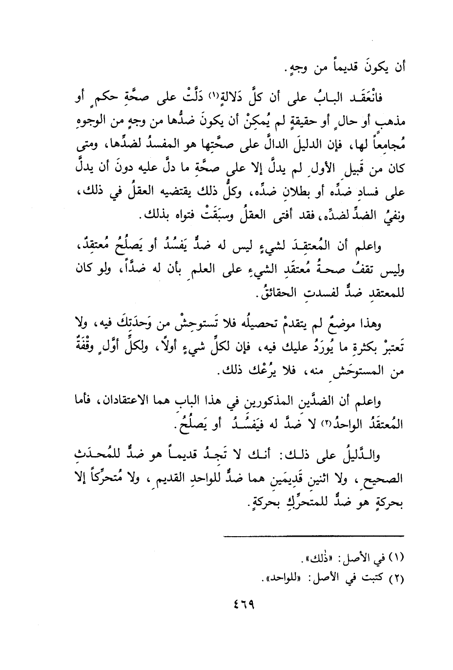واعلم أن المُعتقِدَ لشيءٍ ليس له ضد يَفسُدُ أو يَصلُحُ مُعتقِدٌ، وليس تقفُ صحةُ فعتقَدِ الشيءِ على العلمِ بأن له ضدَّاً، ولو كان للمعتقدِ ضدٌّ لفسدتِ الحقائقُ.
