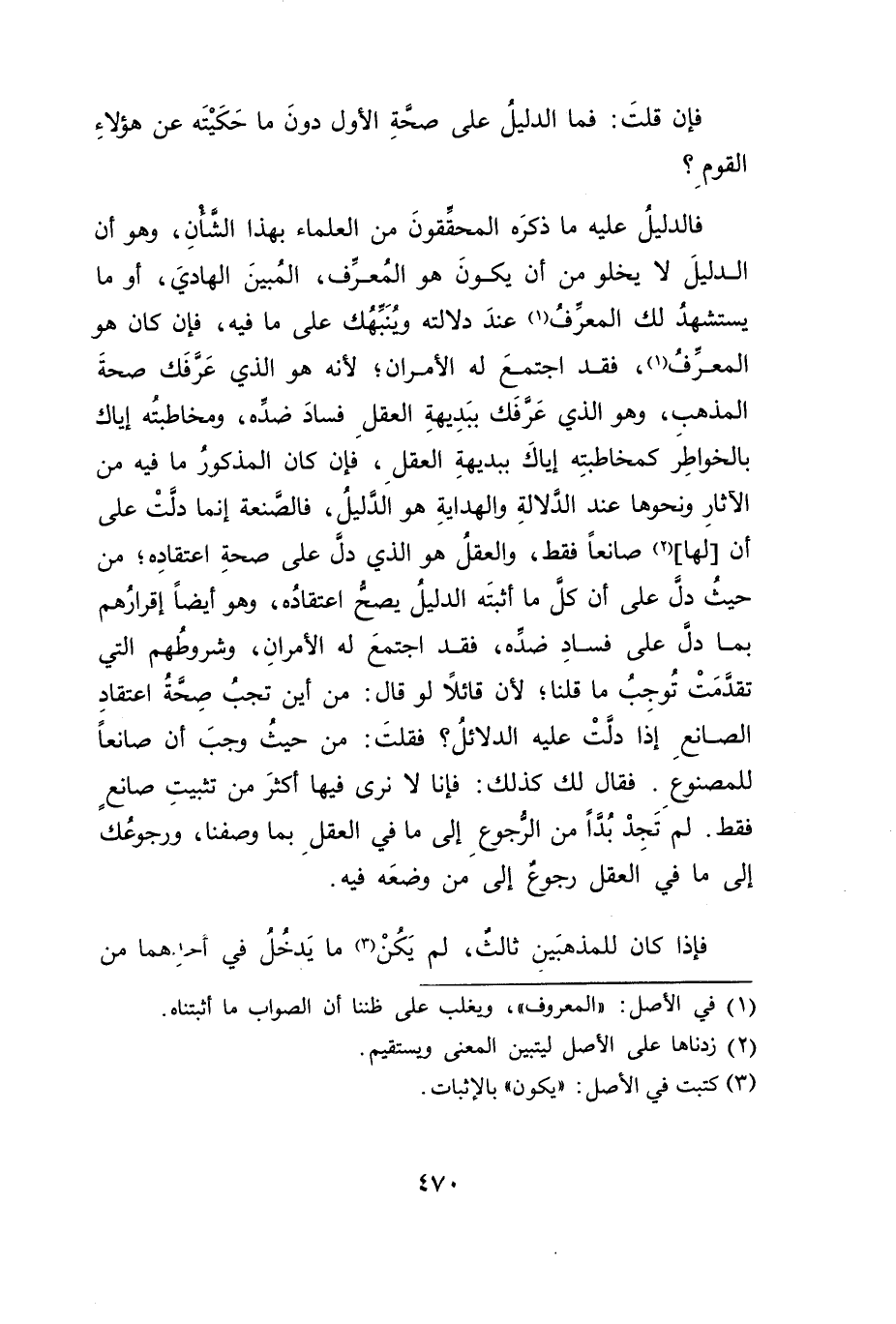 فإن قلتَ: فما الدليلُ على صحَّةِ الأول دونَ ما حَكَيْتَه عن هؤلاءِ القومَ؟ فالدليلُ عليه ما ذكرَه المحقَقونَ من العلماء بهذا الشَّأَنِ، وهو أن الدليلَ لا يخلو من أن يكونَ هو المُعرِّف، المُبينَ الهاديَ، أو ما يستشهدُ لك المعرِّفُ (١) عندَ دلالته وُينَبِّهُك على ما فيه، فإن كان هو المعرِّفُ (١)، فقد اجتمعَ له الأمران؛ لأنه هو الذي عَرَّفَك صحةَ المذهب، وهو الذي عَرَّفَك ببَدِيهةِ العقلِ فسادَ ضدِّه، ومخاطبته إياك بالخواطِرَ كمخاطبتِه إياكَ ببديهةِ العقلِ، فإن كان المذكورُ ما فيه من الآثارِ ونحوها عند الدَّلالةِ والهدايةِ هو الدَّليلُ، فالصَّنعة إنما دلَّتْ على أن [لها] (٢) صانعاً فقط، والعقلُ هو الذي دلَّ على صحةِ اعتقادِه، من حيثُ دلَّ على أن كلَّ ما أثبتَه الدليلُ يصحُّ اعتقادُه، وهو أيضاً إقرارُهم بما دلَّ على فسادِ ضده، فقد اجتمعَ له الأمرانِ، وشروطُهم التي تقدَّمَتْ تُوجِبُ ما قلنا؛ لأن قائلًا لو قال: من أين تجبُ صِحَّةُ اعتقادِ الصانعِ إذا دلَّتْ عليه الدلائل؟ فقلتَ: من حيثُ وجبَ أن صانعاً للمصنوعِ. فقال لك كذلك: فإنا لا نرى فيها أكثرَ من تثبيتِ صانعٍ فقط. لم تَجِدْ بُدَّاً من الرُّجوع إلى ما في العقلِ بما وصفنا، ورجوعُك إلى ما في العقل رجوعُ إلىَ من وضعَه فيه.