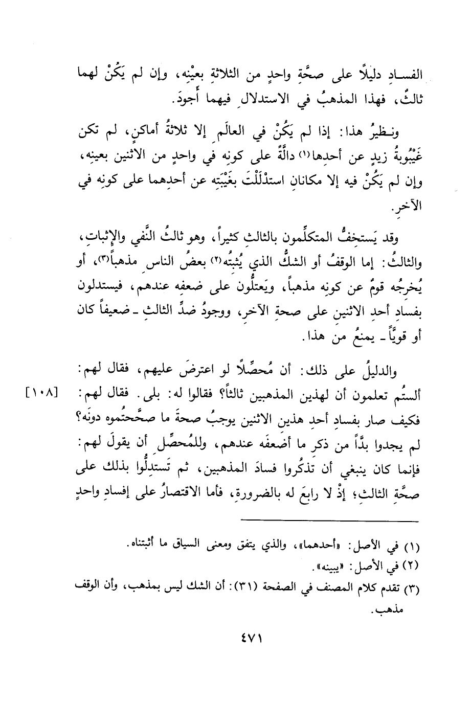 وقد يَستخِفُّ المتكلِّمون بالثالثِ كثيراً، وهو ثالثُ النَفي والإِثباتِ، والثالثُ: إمَّا الوقفُ أو الشك الذي يُثبتُه (٢) بعضُ الناسِ مذهباً (٣)، أو يُخرِجُه قومٌ عن كونِه مذهباً، ويَعتلونَ على ضعفِه عندهم، فيستدلون بفسادِ أحدِ الاثنينِ على صحةِ الأخرِ، ووجودُ ضد الثالثِ -ضعيفاً كان أو قوَياً- يمنعُ من هذا.
