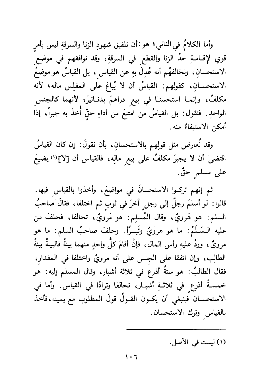 وأما الكلامُ في الثاني؛ هو: أن تلفيق شهودِ الزنا والسرقةِ ليس بأمرٍ قوي لإِقامةِ حد الزنا والقطعِ في السرقةِ، وقد نوافقهم في موضعِ الاستحسانِ، ونخالفهُم أنه عُدِلَ بهِ عن القياسِ، بل القياسُ هو موضعُ الاستحسانِ، كقولهم: القياسُ أن لا يُباعَ على المفلِس ماله، لأنه مكلف، وإنما استحسنا في بيعِ دراهمَ بدنانيرَ، لأنهما كالجنسِ الواحدِ. فنقول: بل القياسُ من امتنعَ من أداءِ حقٍّ أخذَ به جبراً، إذا أمكن الاستيفاءُ منه.
