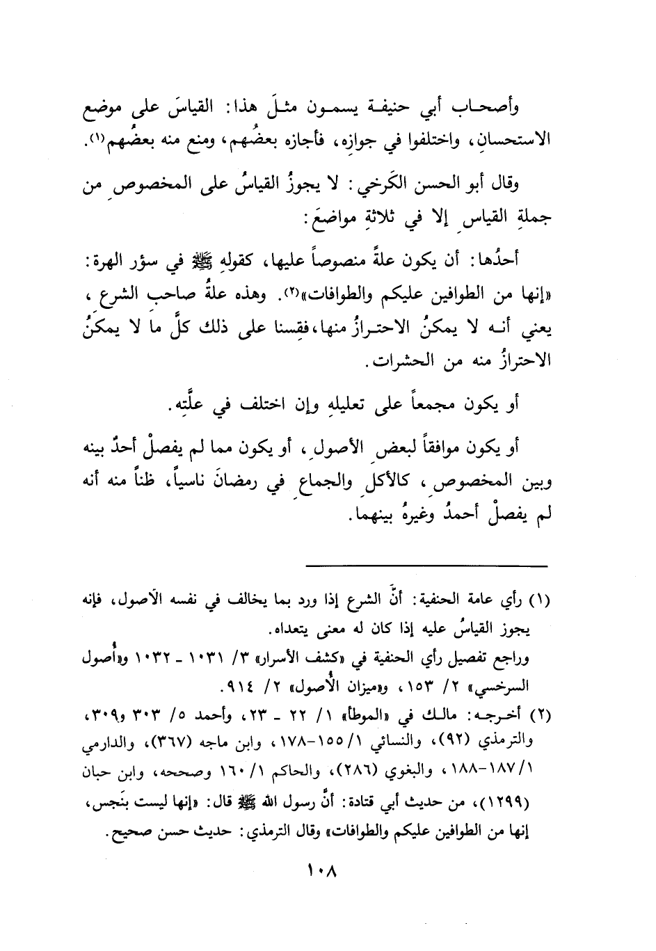 أحدُها: أن يكون علَّةُ منصوصاً عليها، كقولهِ - صلى الله عليه وسلم - في سؤر الهرة: "إنها من الطوافين عليكم والطوافات" (٢). وهذه علَّةُ صاحب الشرع، يعني أنه لا يمكنُ الاحترازُ منها، فقِسنا على ذلك كلُّ ماَ لا يمكَنُ الاحتراز منه من الحشرات.