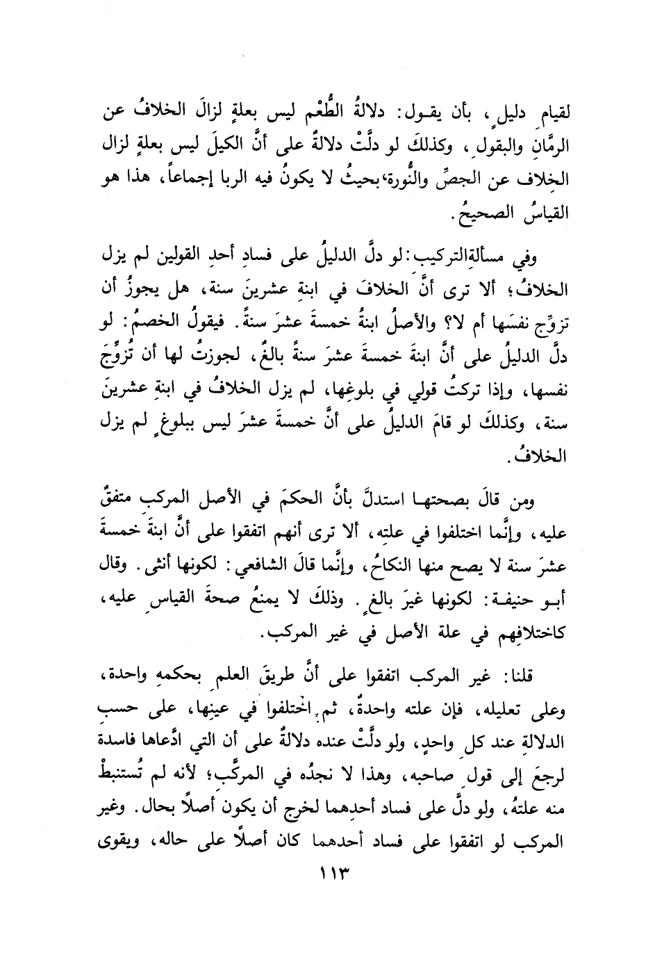 وفي مسألةِ التركيب: لو دل الدليلُ على فسادِ أحدِ القولين لم يزل الخلافُ؛ ألا ترى أنَ الخلافَ في ابنةِ عشرينَ سنة، هل يجوزُ أن تزوِّج نفسَها أم لا؟ والأصلُ ابنةُ خمسةَ عشرَ سنةً. فيقولُ الخصمُ: لو دل الدليلُ على أنَ ابنةَ خمسةَ عشرَ سنةً بالغ، لجوزتُ لها أن تُزوِّجَ نفسها، وإذا تركتُ قولي في بلوغِها، لم يزل الخلافُ في ابنةِ عشرينَ سنة، وكذلكَ لو قامَ الدليلُ على أنَ خمسةَ عشرَ ليس ببلوغ لم يزل الخلافُ.
