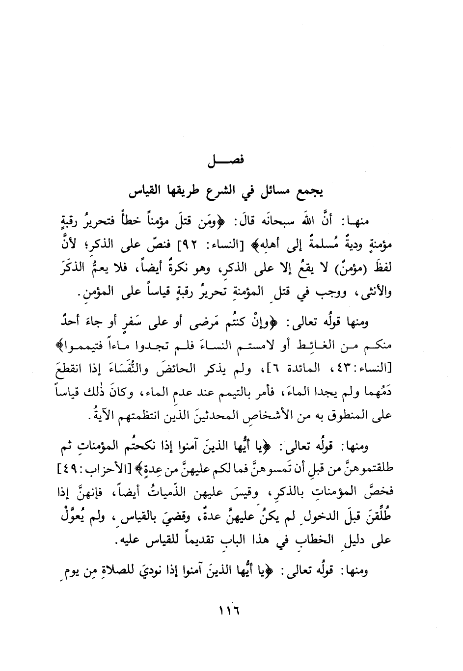 منها: أنَّ اللهَ سبحانَه قالَ: {ومَن قتلَ مؤمناً خطأً فتحريرُ رقبةٍ مؤمنةٍ ودية مُسلمة إلى أهلِه} [النساء: ٩٢]، فنصّ على الذكرِ؛ لأنَ لفظَ (مؤمنٌ) لا يقع إلا على الذكرِ، وهو نكرة أيضاً، فلا يعمُ الذكَرَ والأنثى، ووجب في قتلِ المؤمنةِ تحرير رقبةٍ قياساً على المؤمنِ.